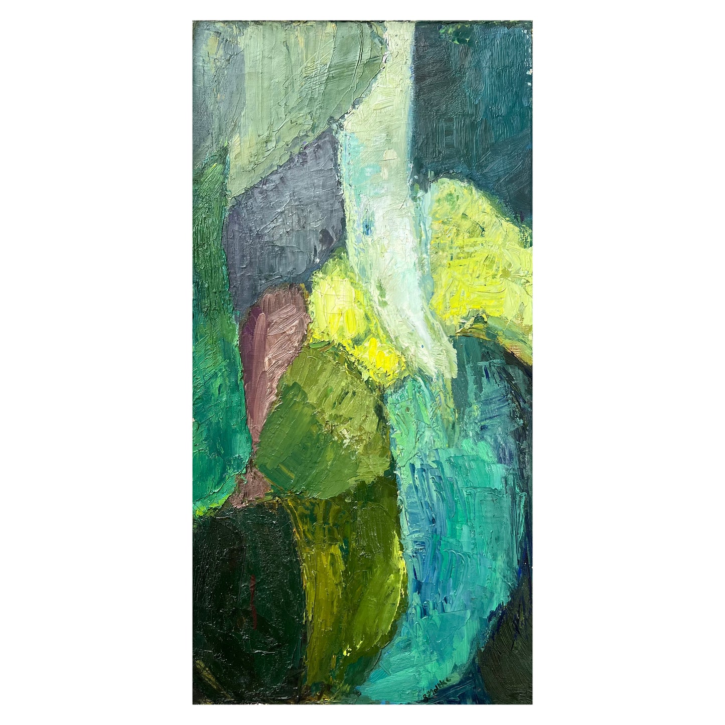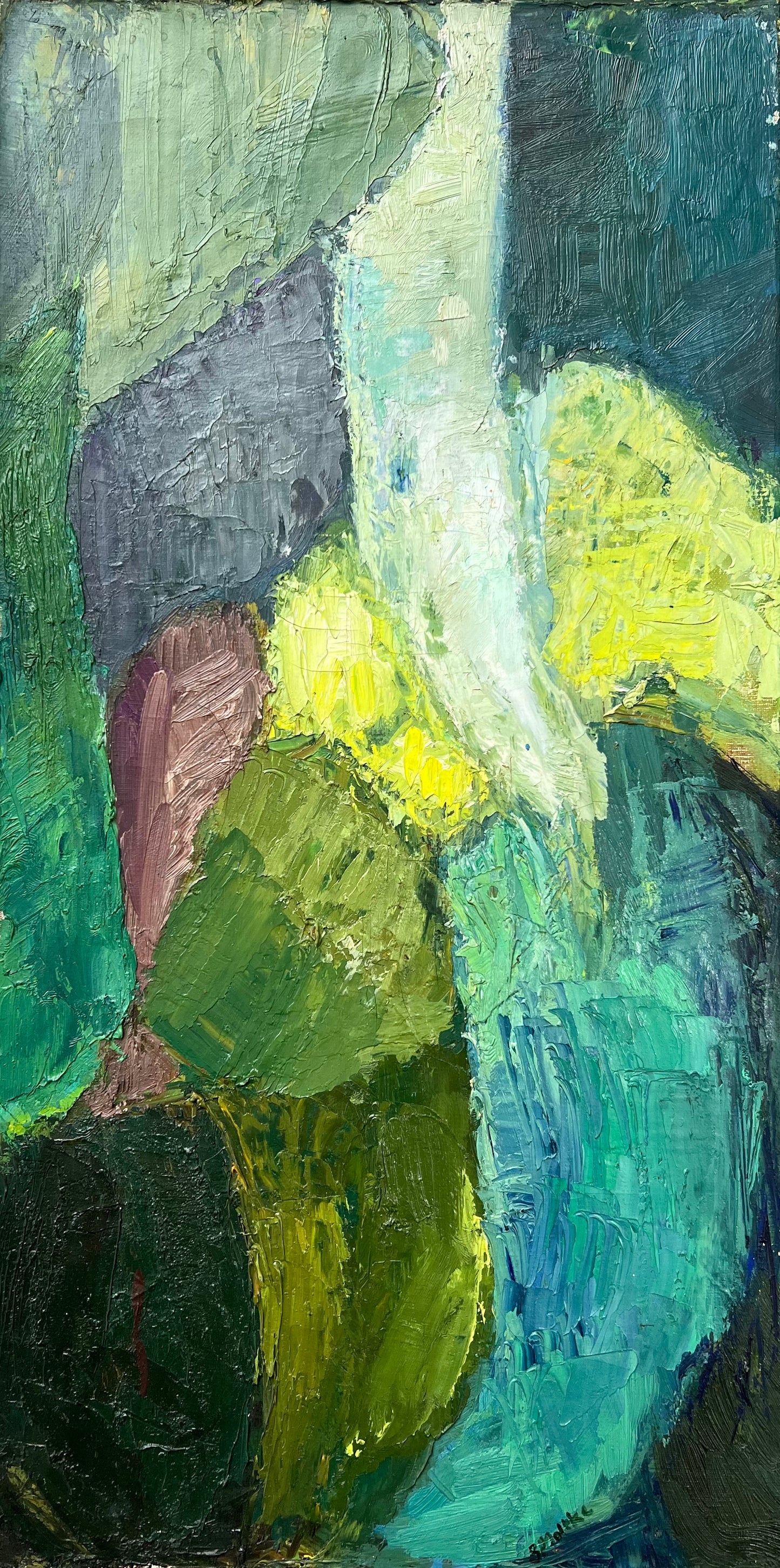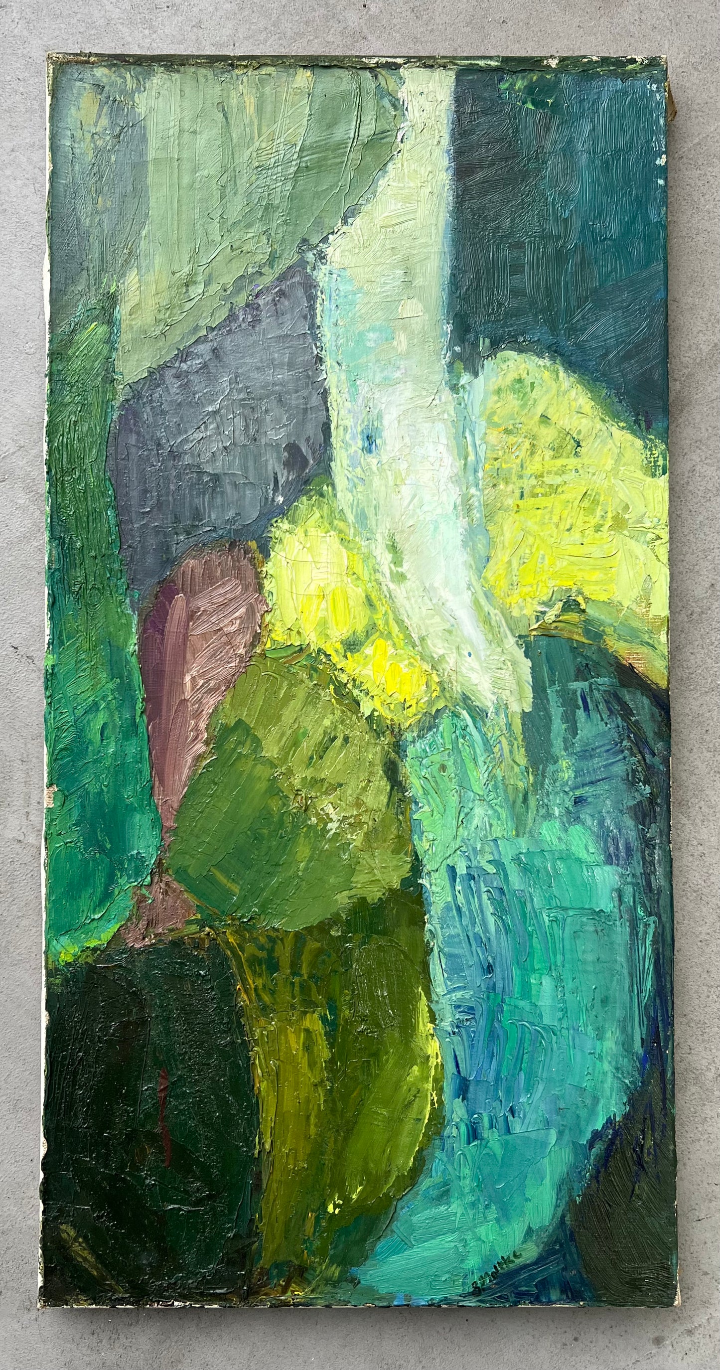 Berta Grete Moltke-Huitfeldt (b. 1938). Composition, oil on canvas, signed. 60 x 30 cm. Unframed. Craquelures and small peelings along edge.