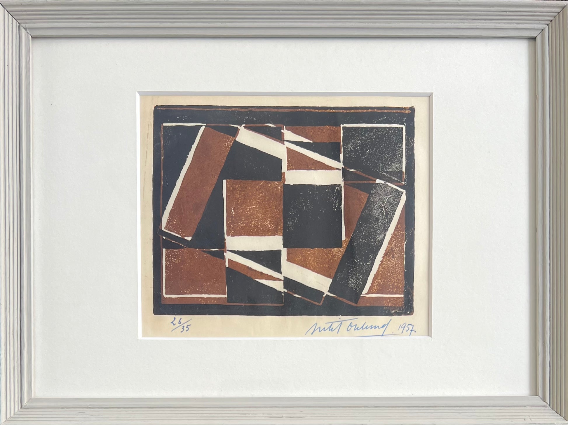 Bertil Öhlund (1923-2003). Composition, linocut, 26/35, signed and dated 1957. 14 x 17 (24 x 32) cm. Grey painted frame.