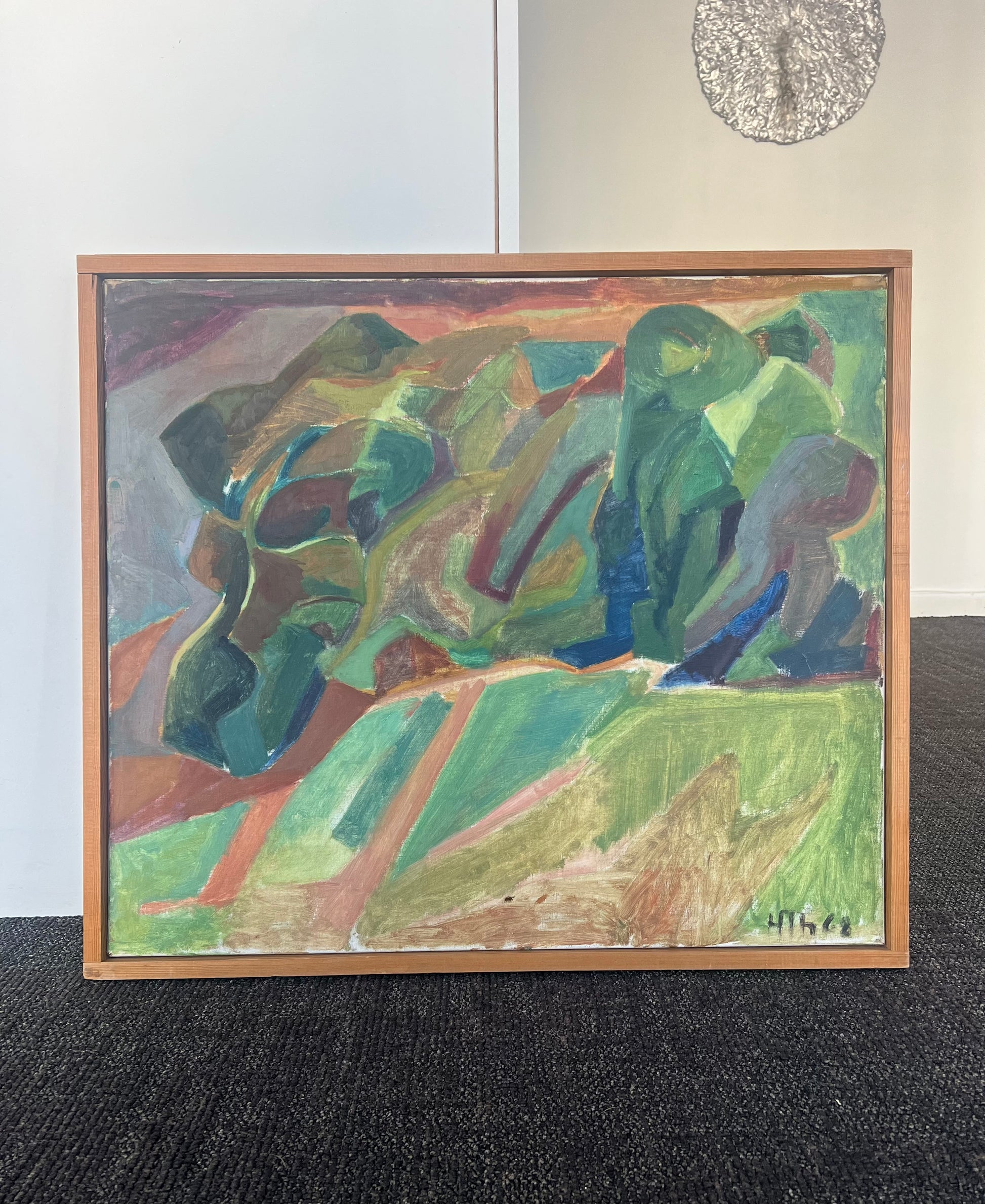 Helle Thorborg (1927-2025). Composition, oil on canvas, signed and dated. 63 x 72 (65 x 74) cm. Pine frame.