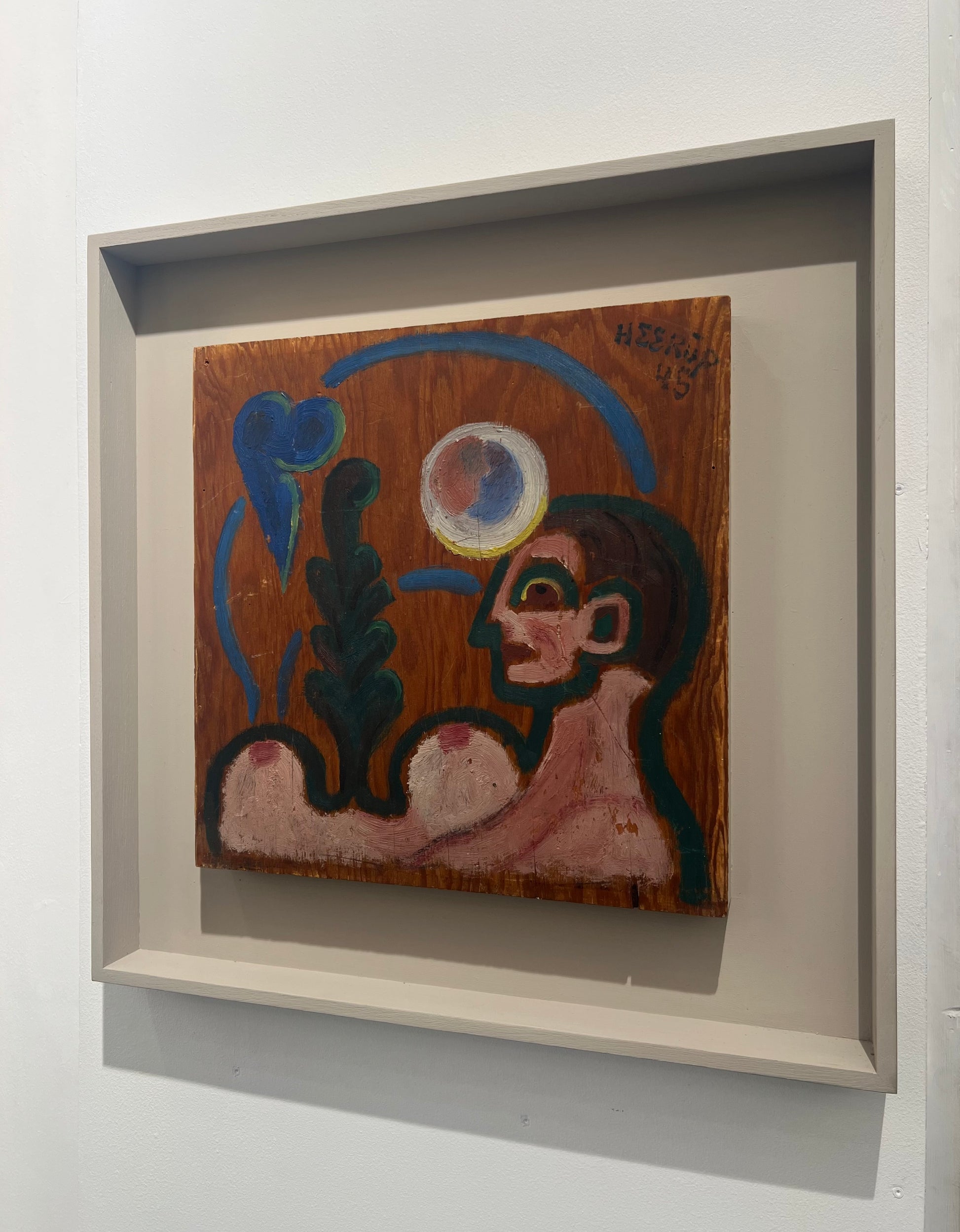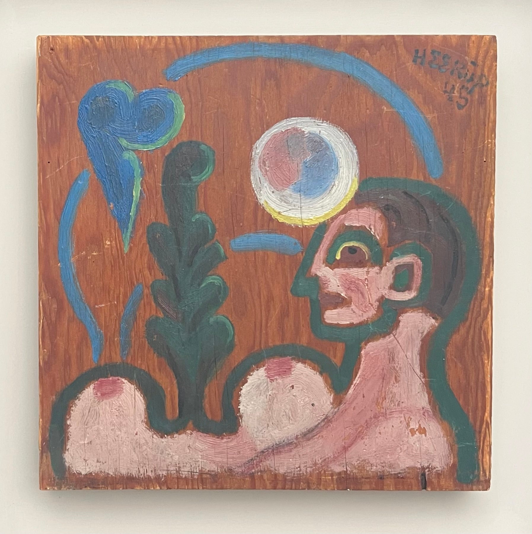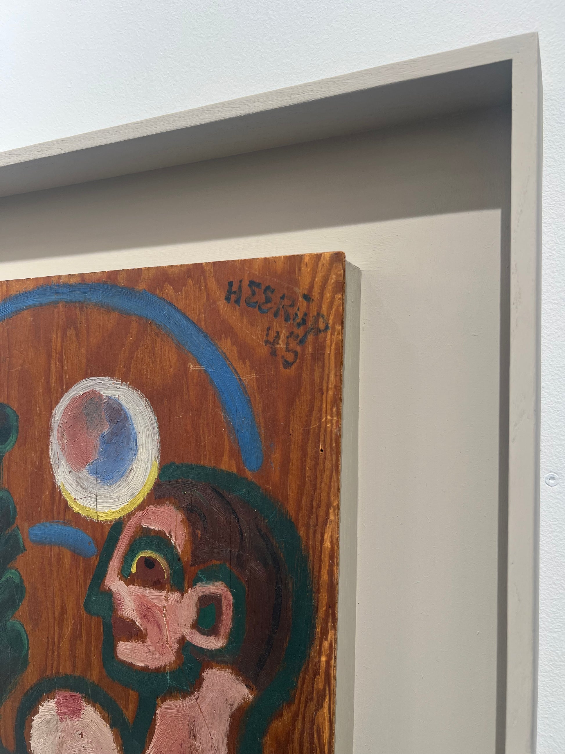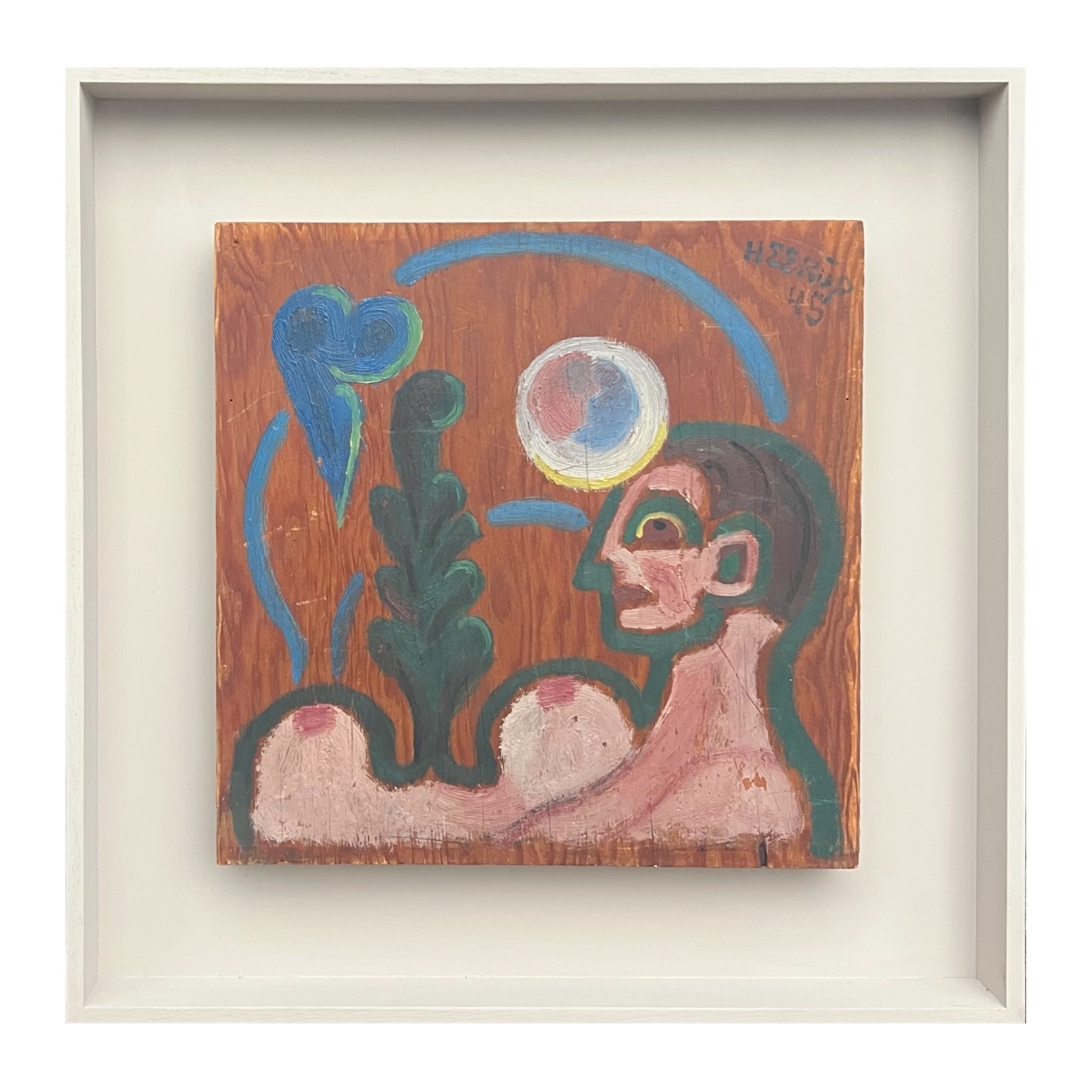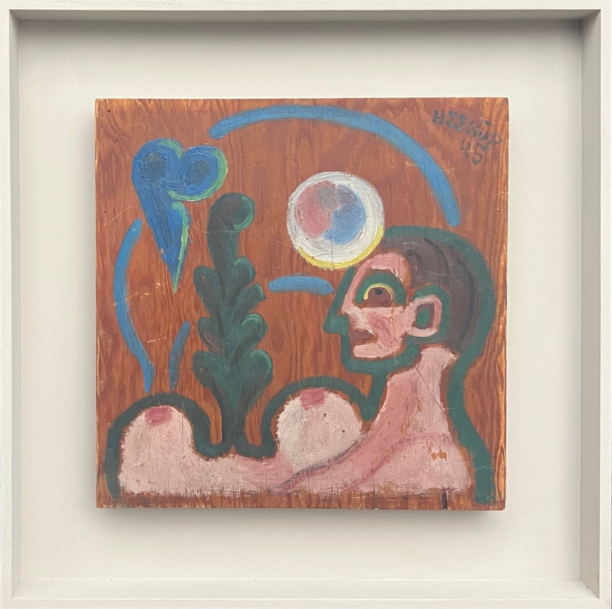 Henry Heerup (1907-1993). Surreel composition, oil on board, signed and dated Heerup 45. 33,5 x 33,5 (50 x 50 x 5) cm. New handbuilt and painted frame from Atelier Hjorth-Rohde.