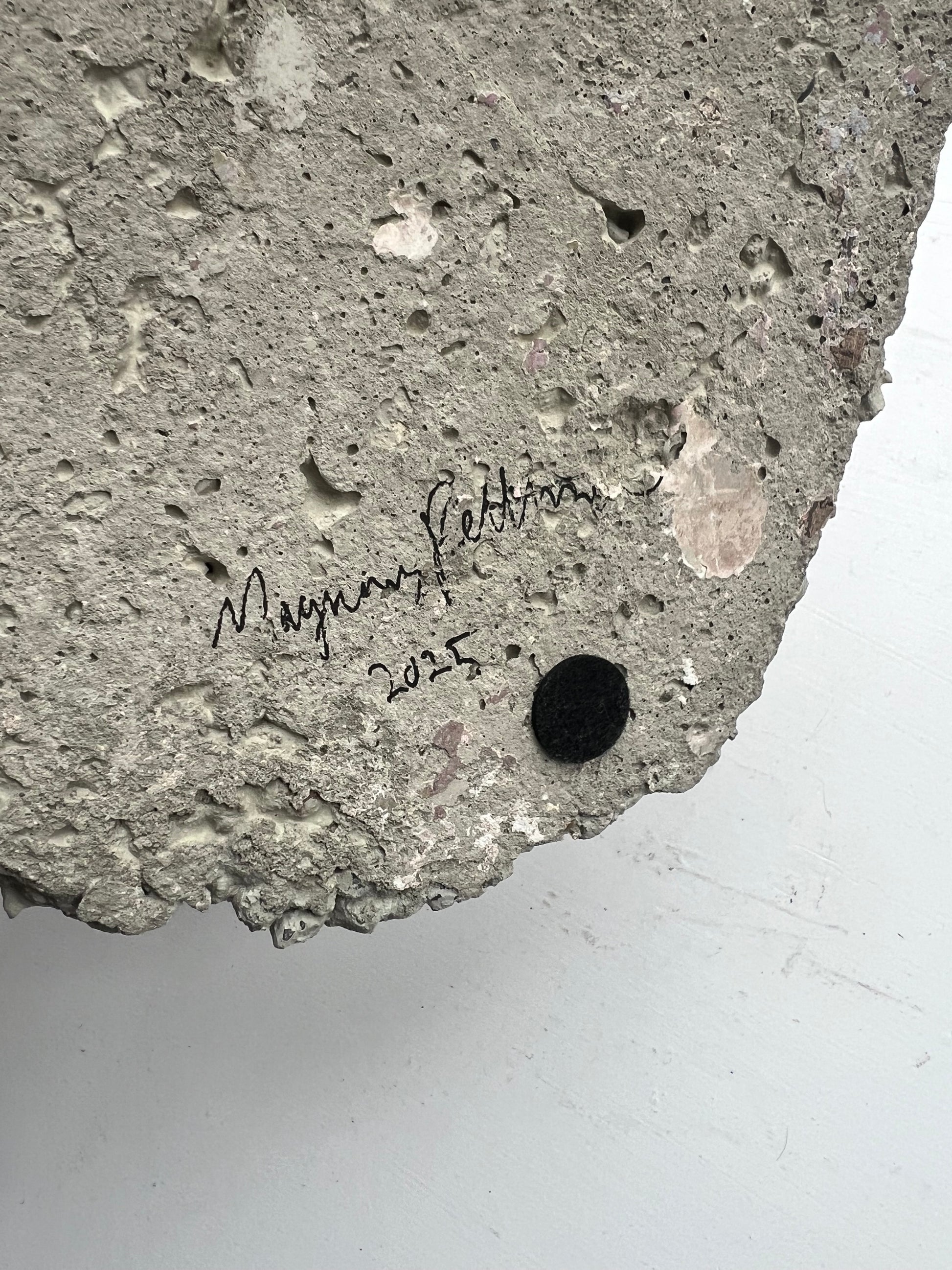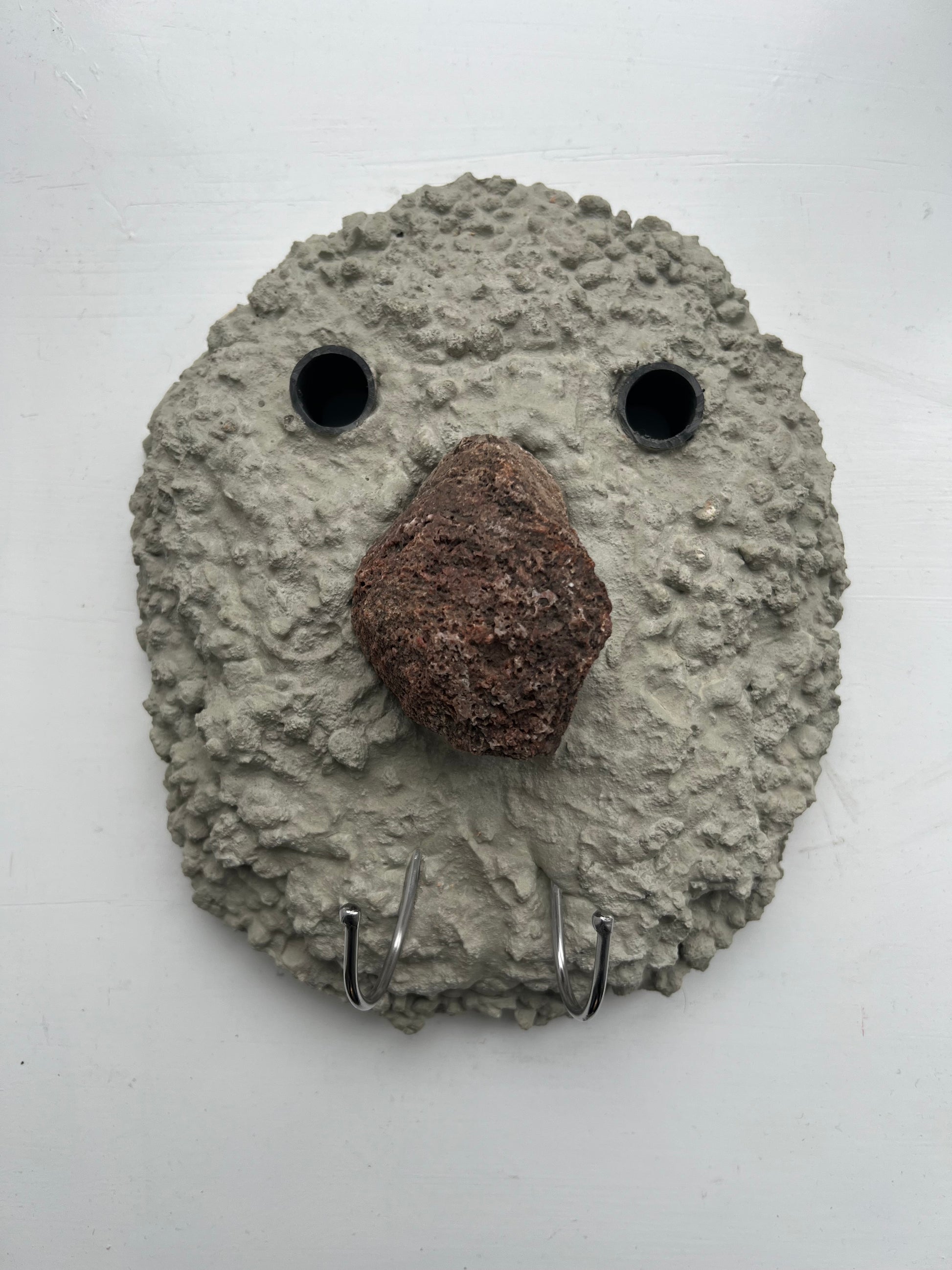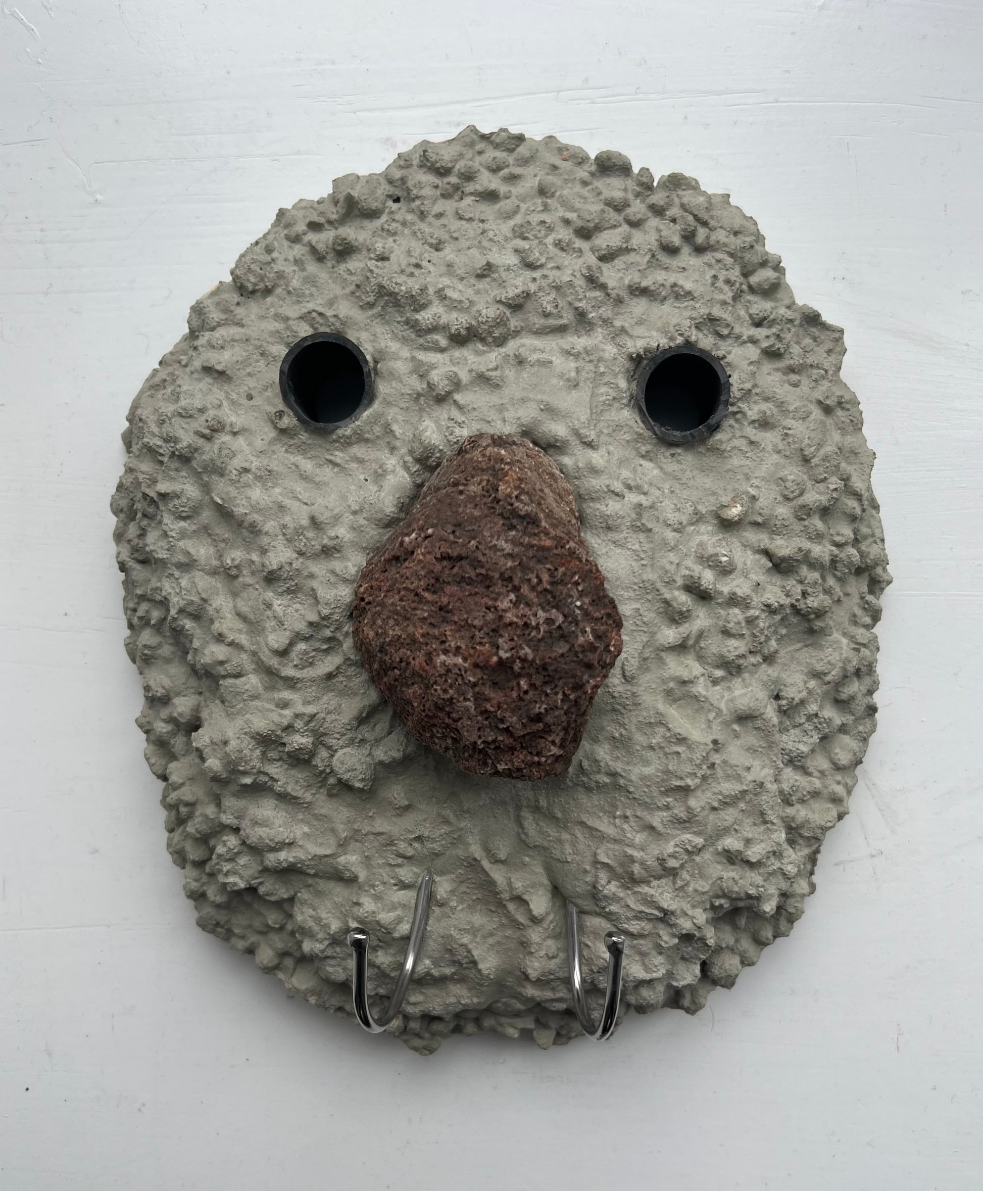 Magnus Pettersen (b. 1983). Coat rack, concrete and stone, mounted with two metal hooks. Signed and dated 2025. 27 x 23, D. 12 cm.