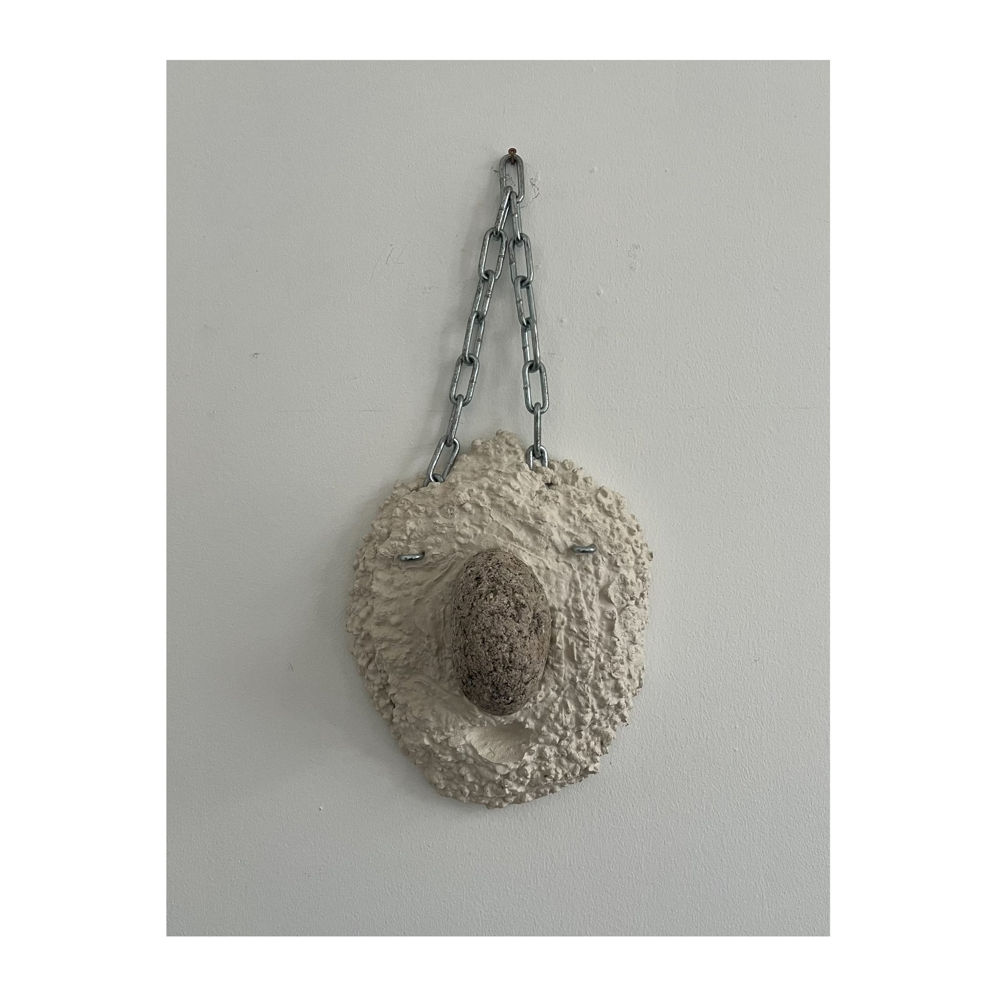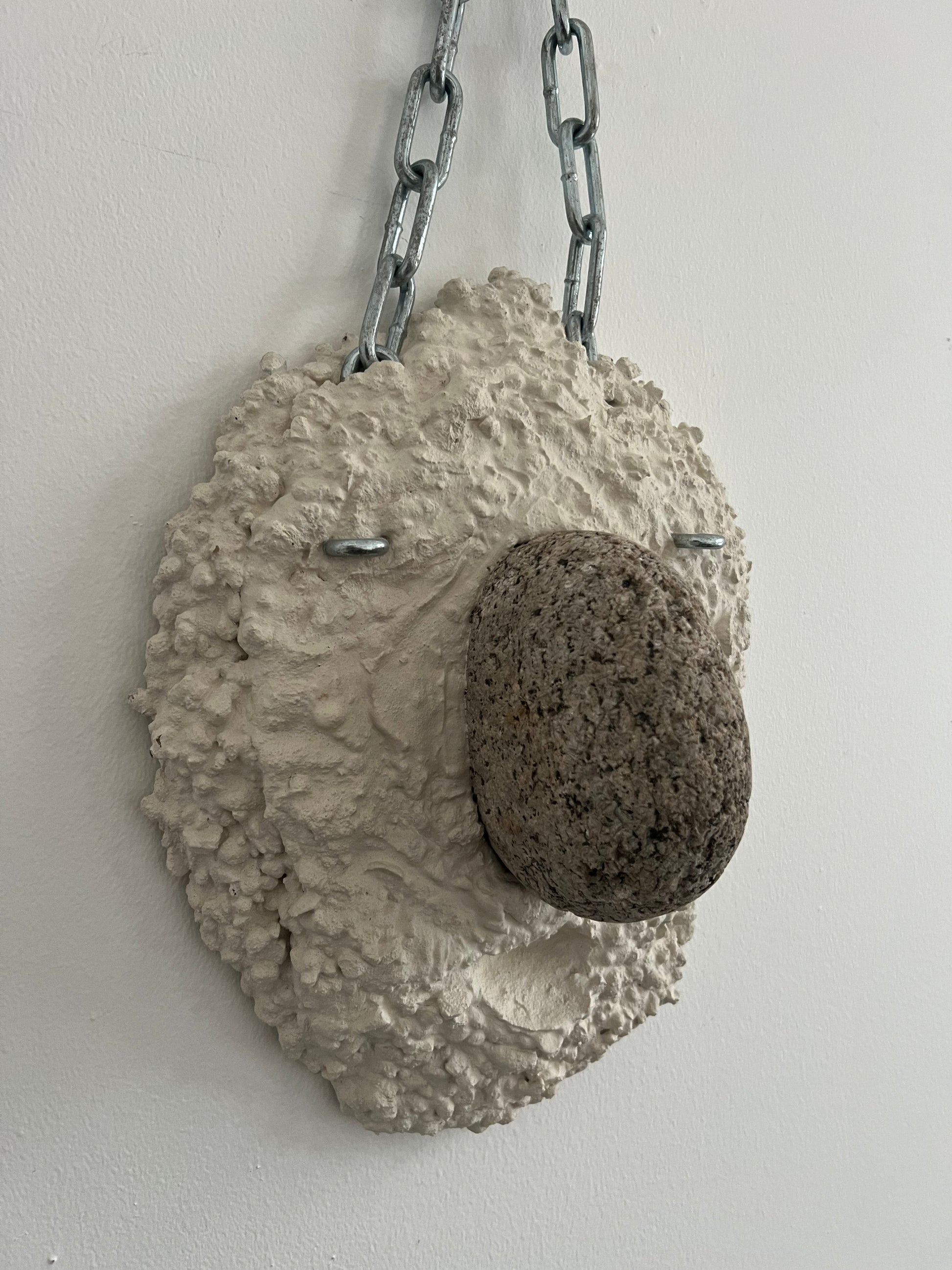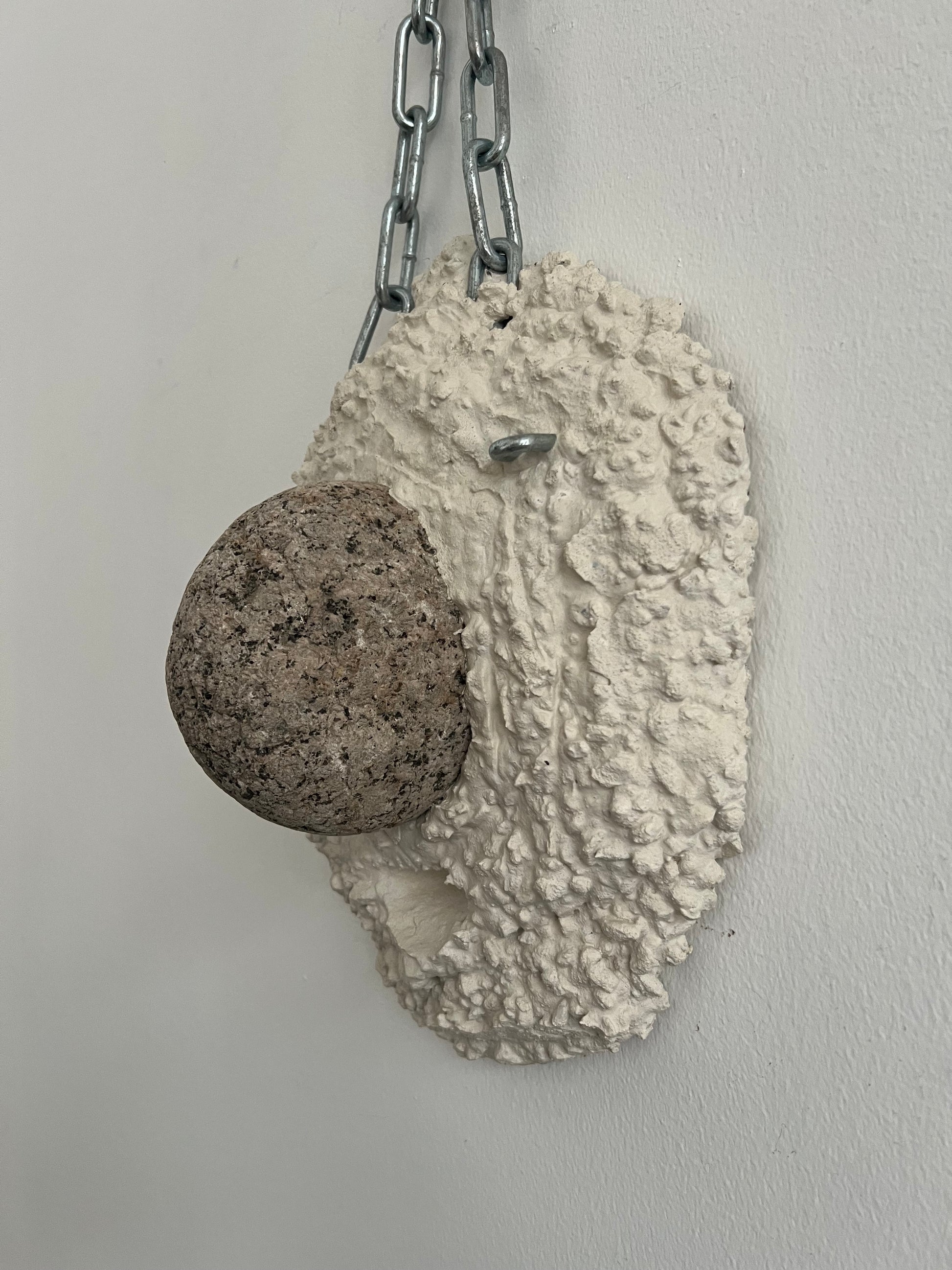 Magnus Pettersen (b. 1983). Hanging sculpture, concrete, and stone, mounted in steel chain for hanging. Signed and dated. H. 37/60, W. 27, D. 14 cm.