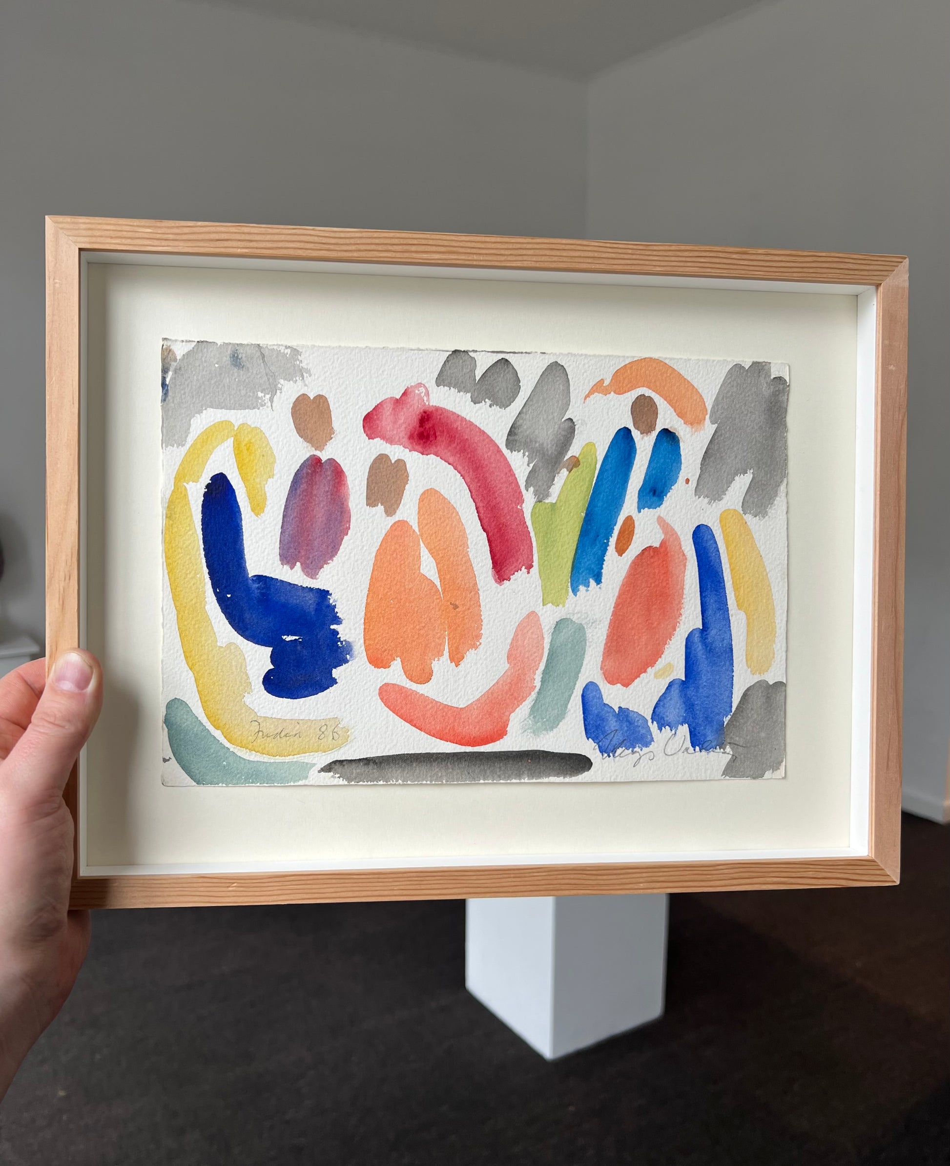 Mogens Valeur (1927-2000). Composition, watercolour on paper, signed and dated Mogens Valeur, India, 1986. 19 x 28 (28 x 37) cm. New Douglas pine frame, museumglass.