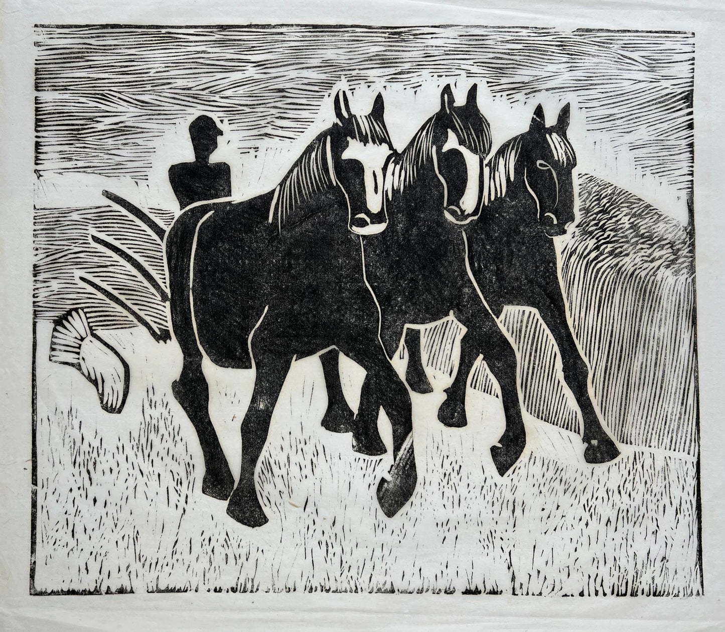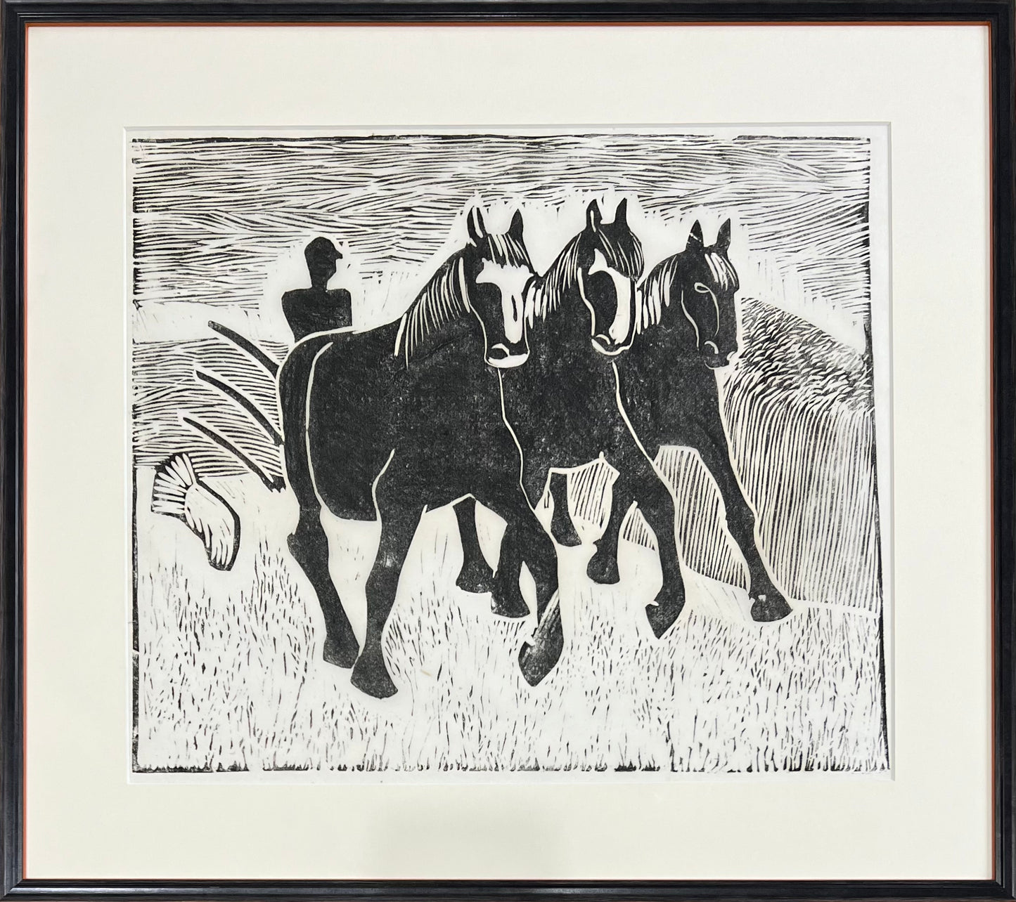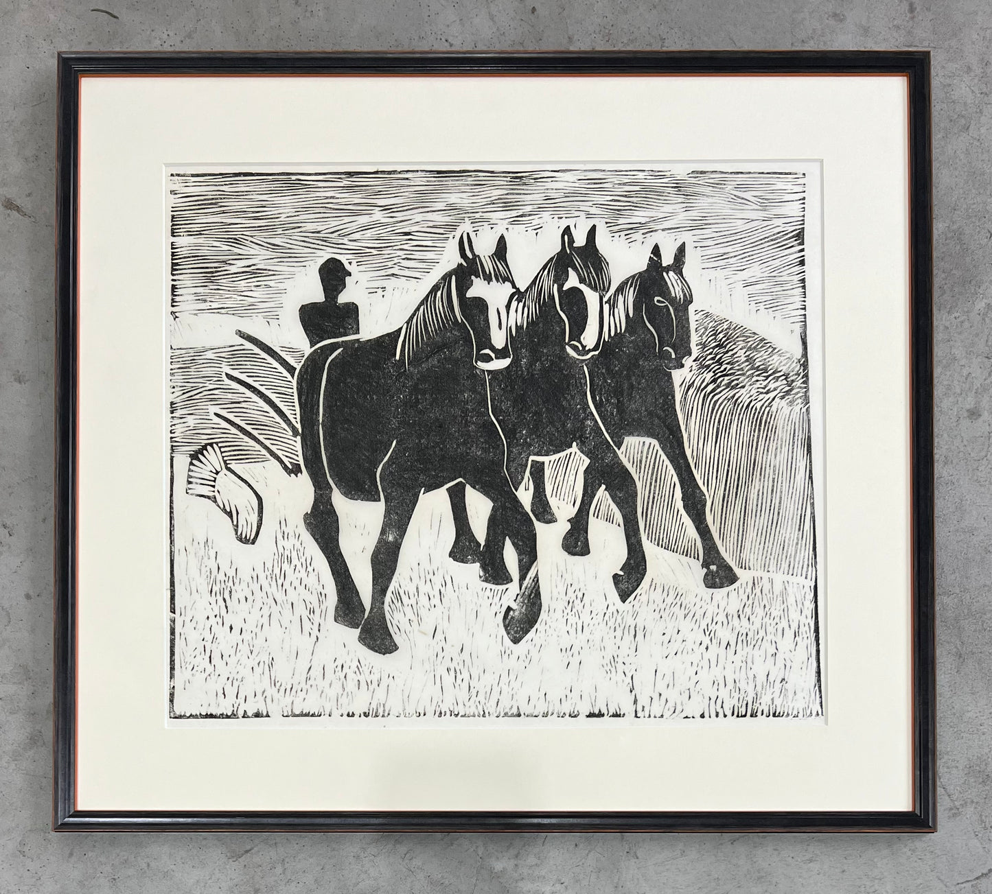 Olivia Holm-Møller (1875-1970). Three horses pulling the plow, large woodcut on japan paper, unsigned. 52 x 58 cm. Mounted in passepartout. Unframed.