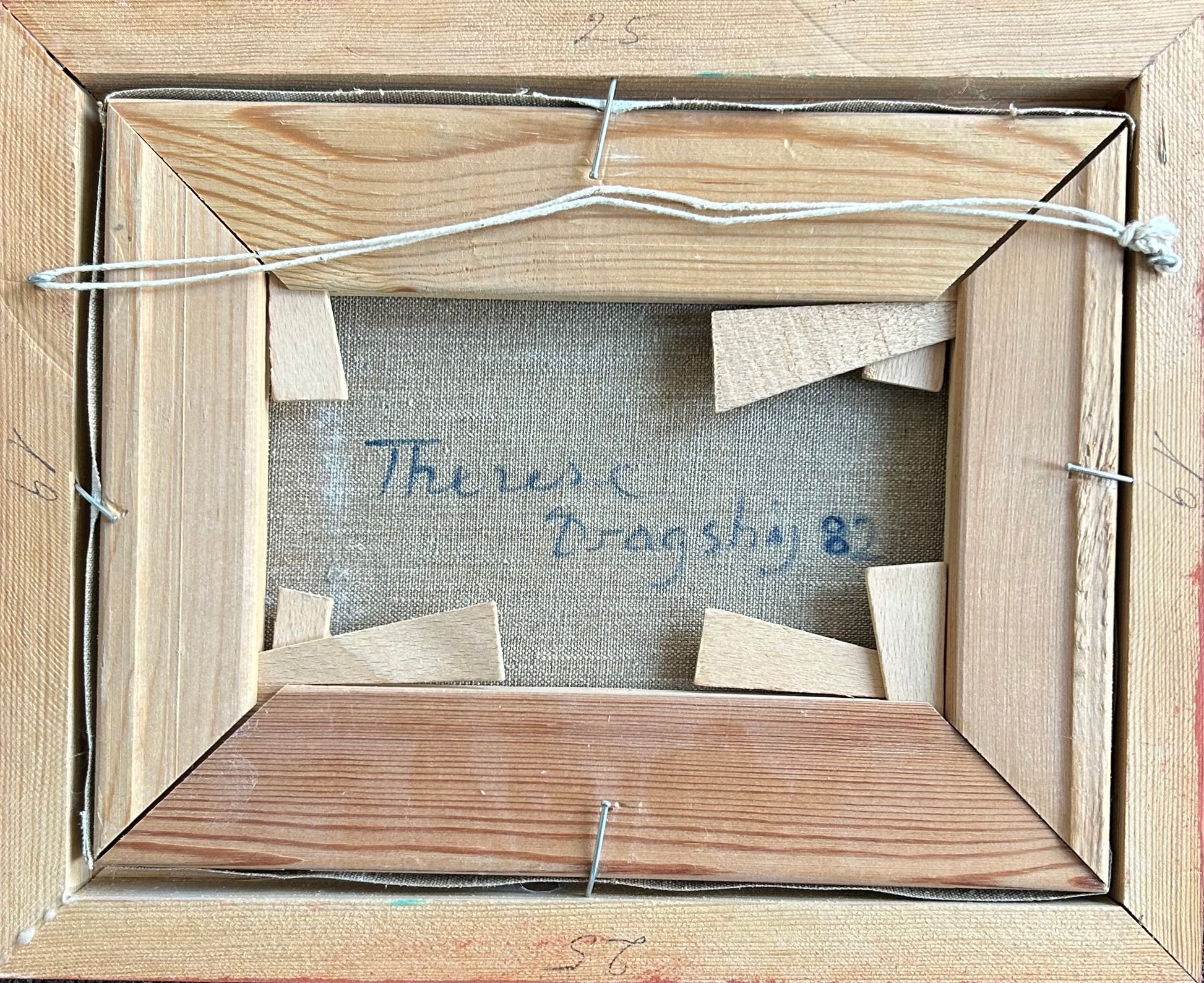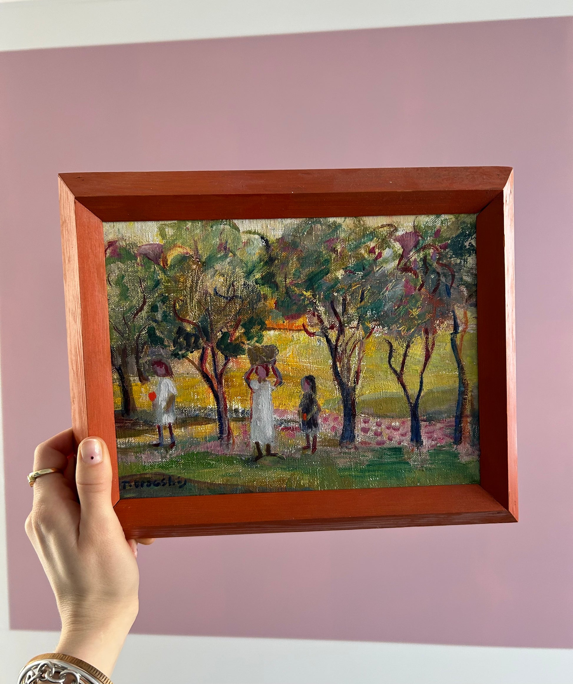 Therese Dragshøj (1909-1998). Landscape with figures, oil on canvas, signed and dated. 17 x 22,5 (23 x 29) cm. Framed.