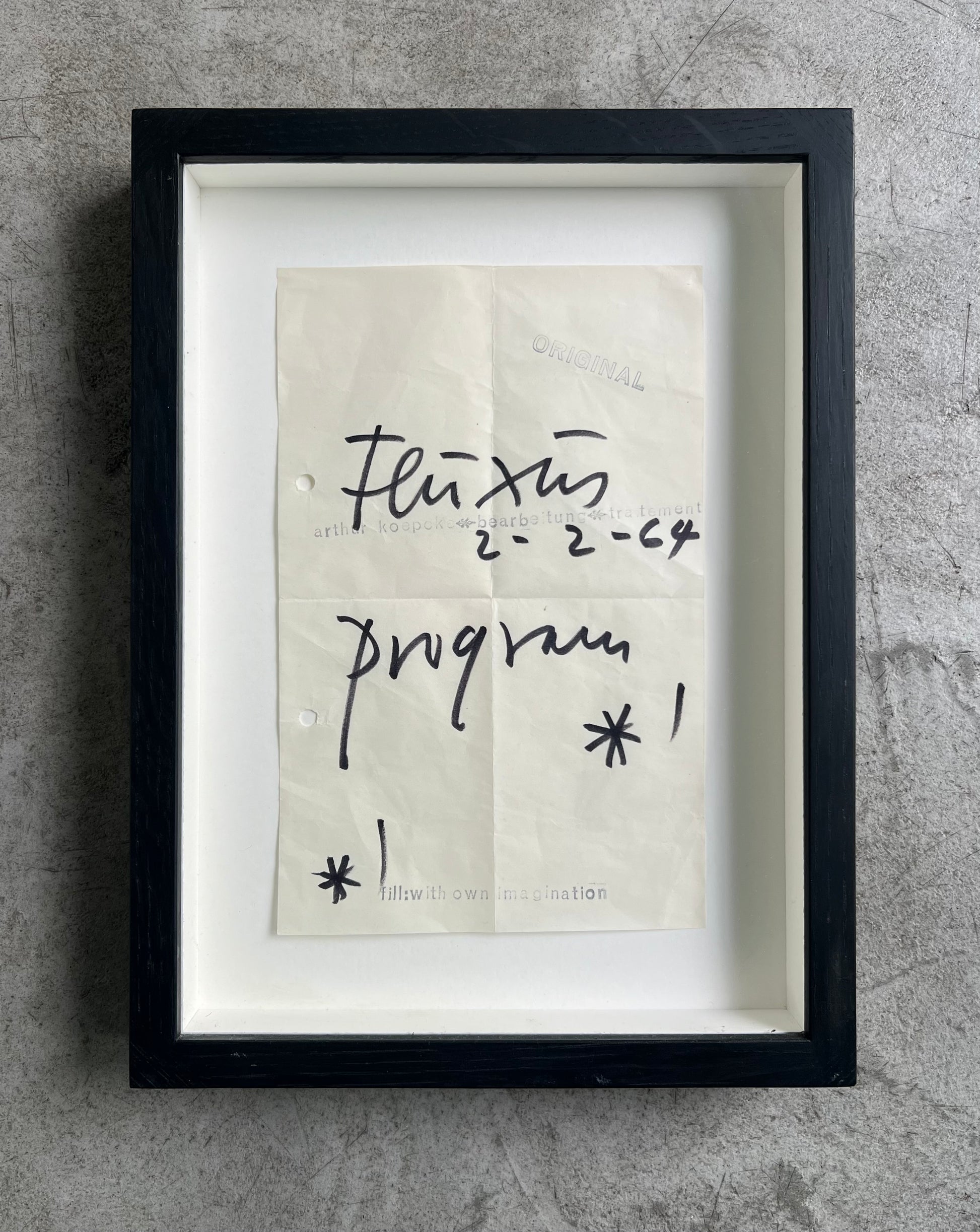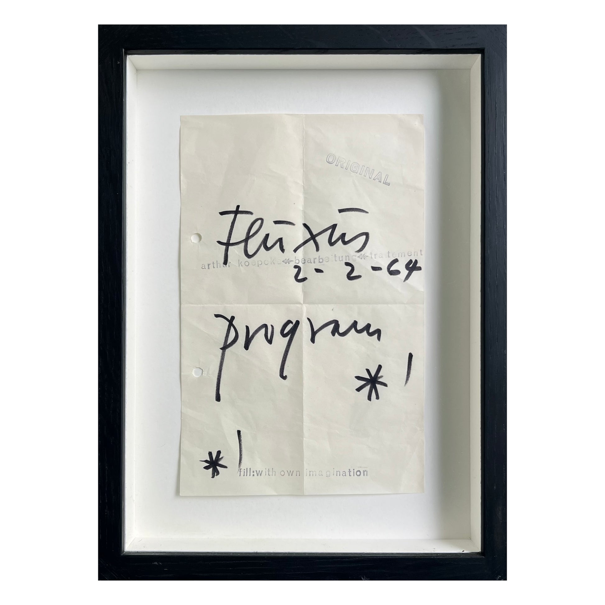 Arthur Køpcke (1928-1977). “Fluxus program”, stamp and marker on paper, signed with stamp. 22 x 14 (30 x 22 x 4) cm. Black painted wood frame, museum glass.