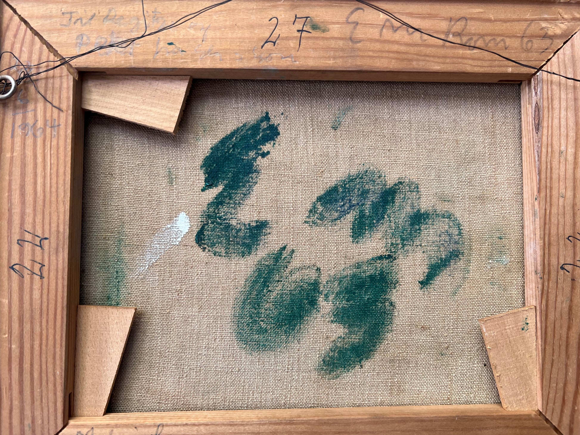 Egon Mathiesen (1907-1976). Composition, oil on canvas, signed and dated EM, Rom, 1963. 27 x 22 cm. Pine frame.