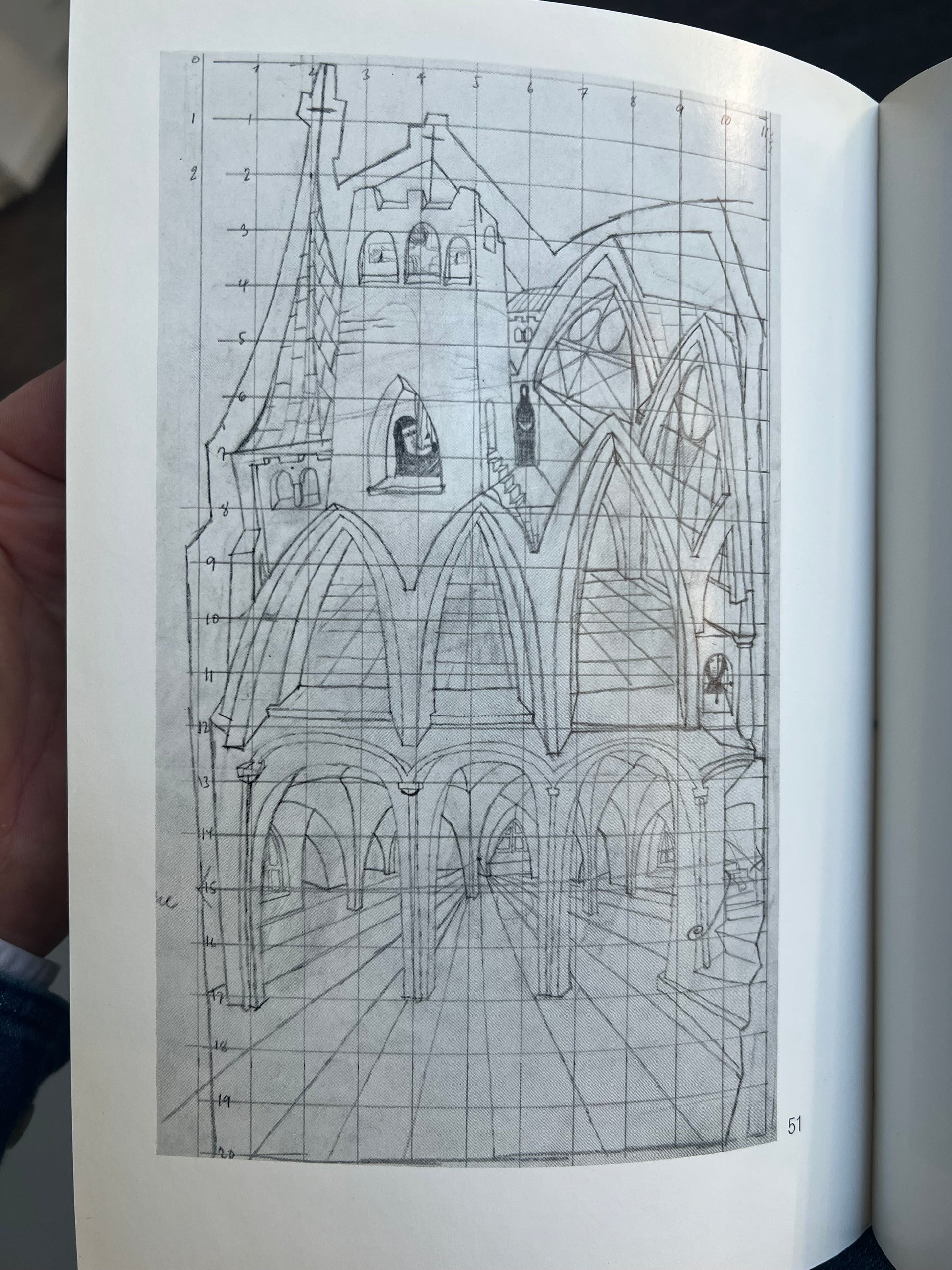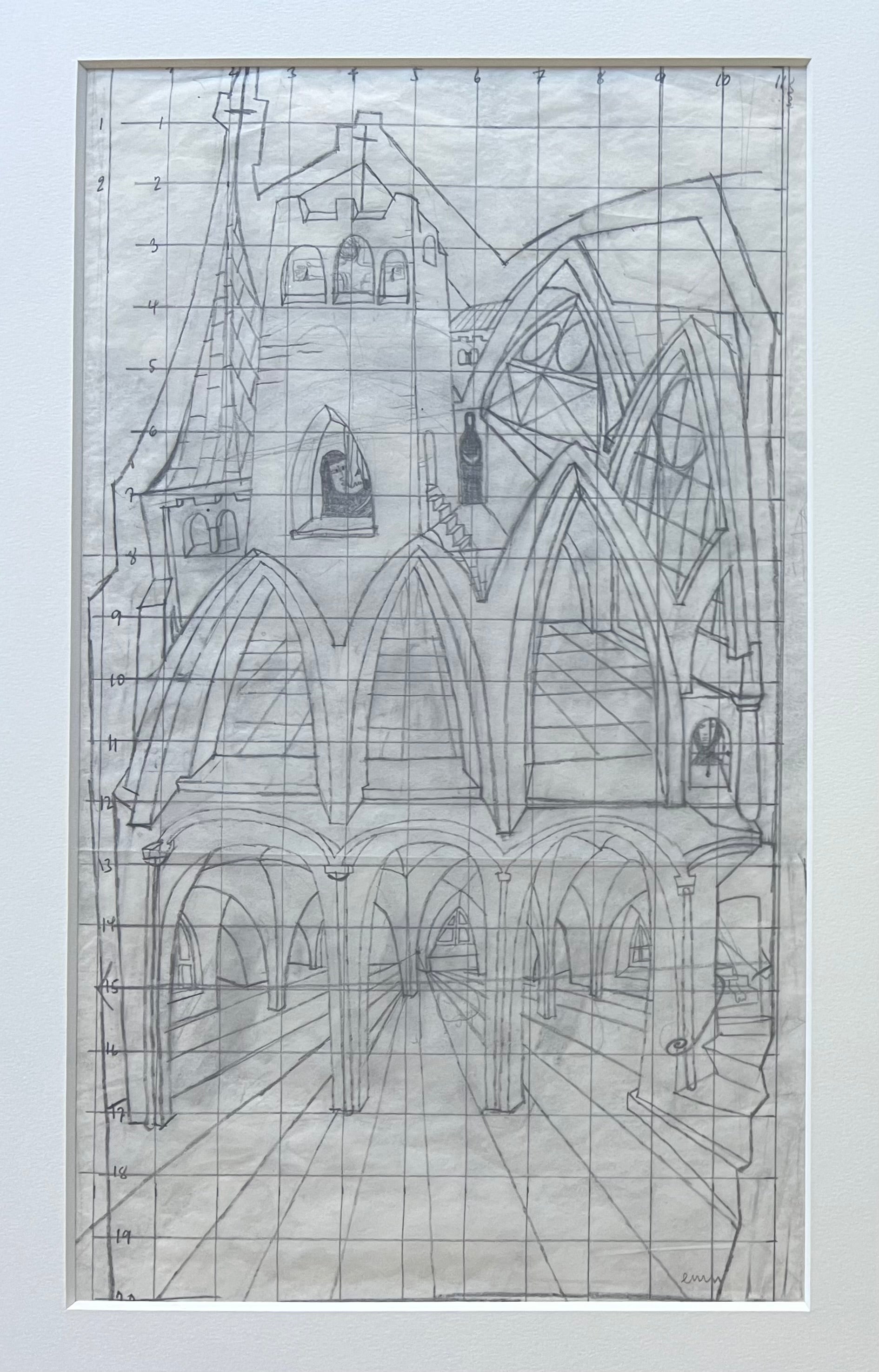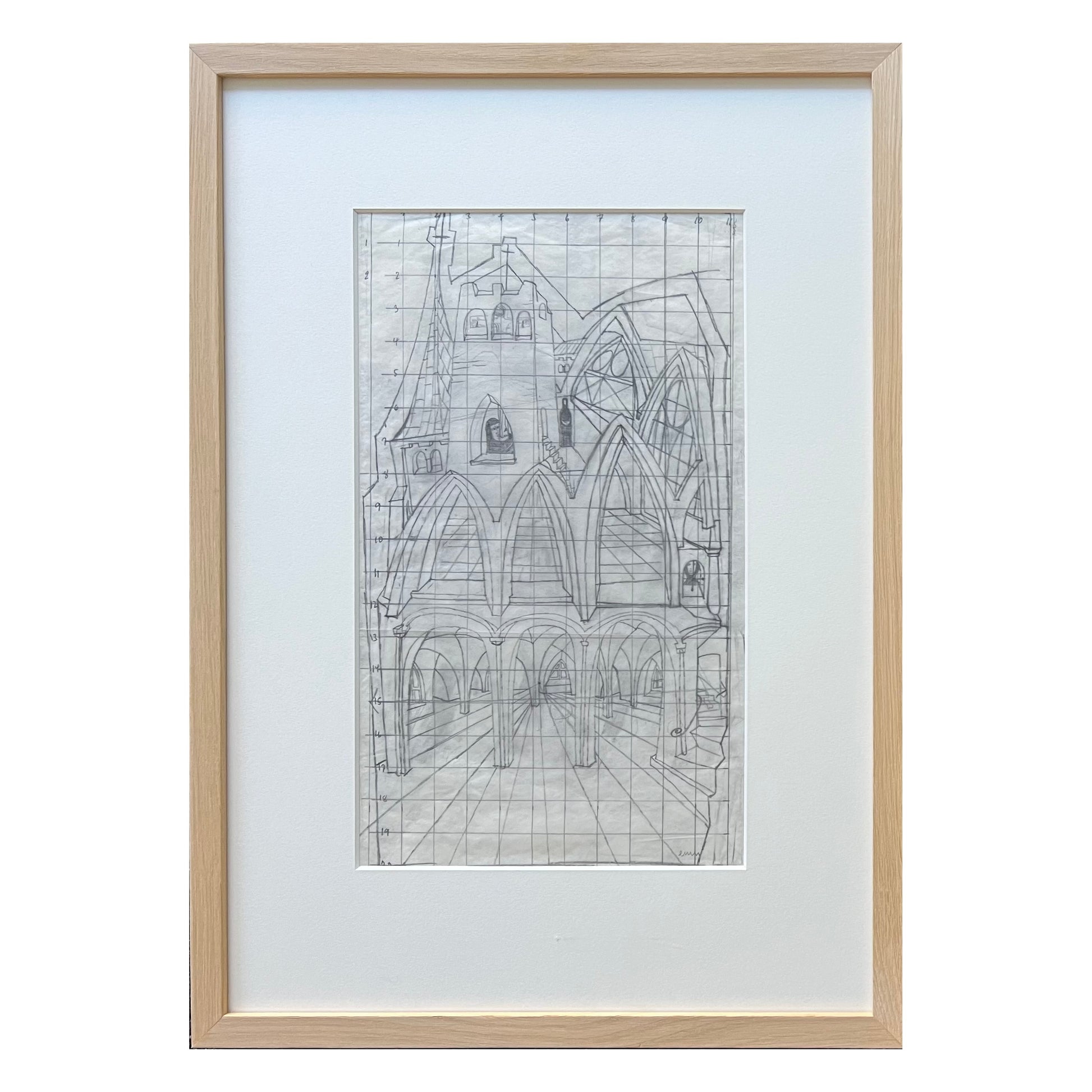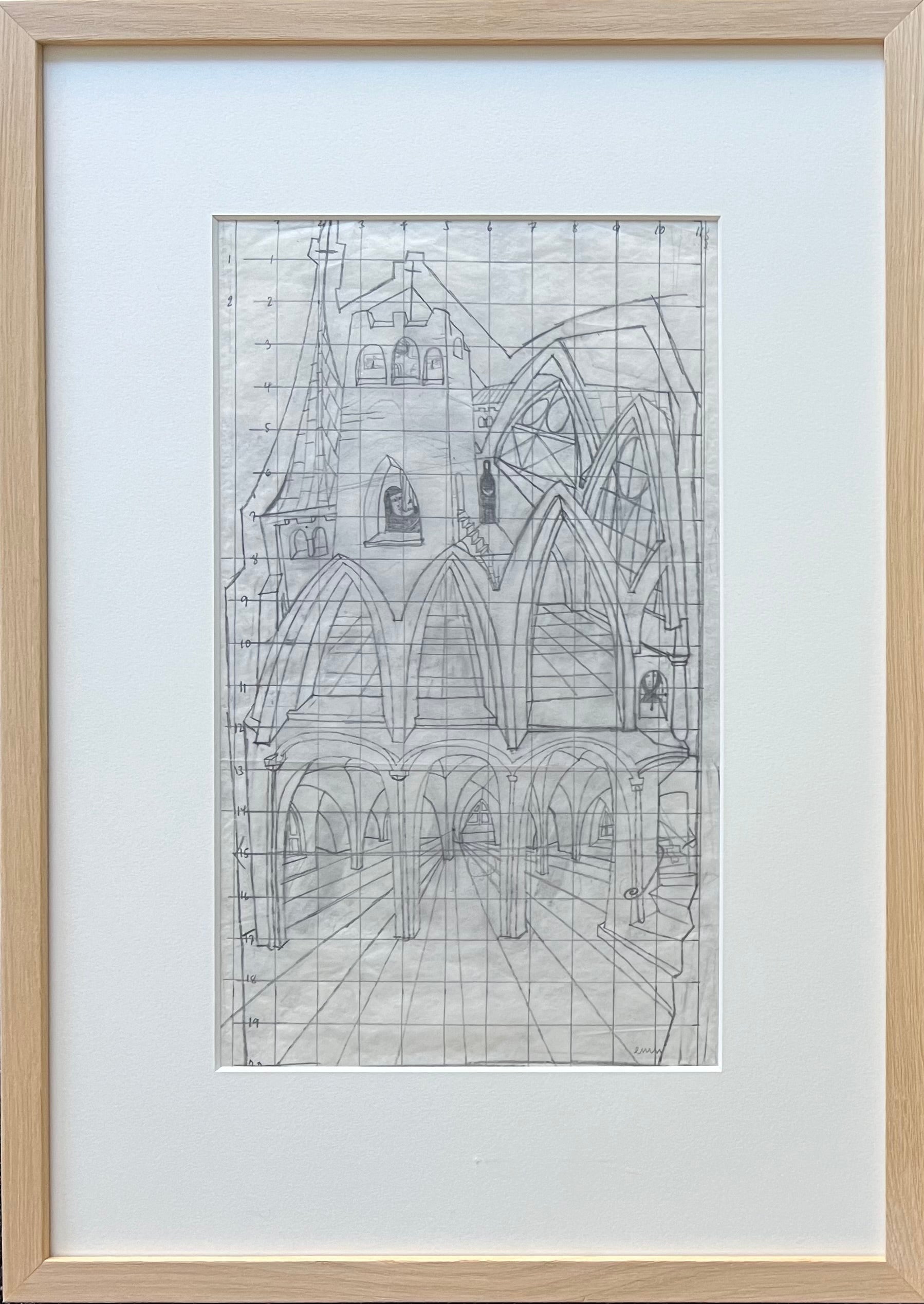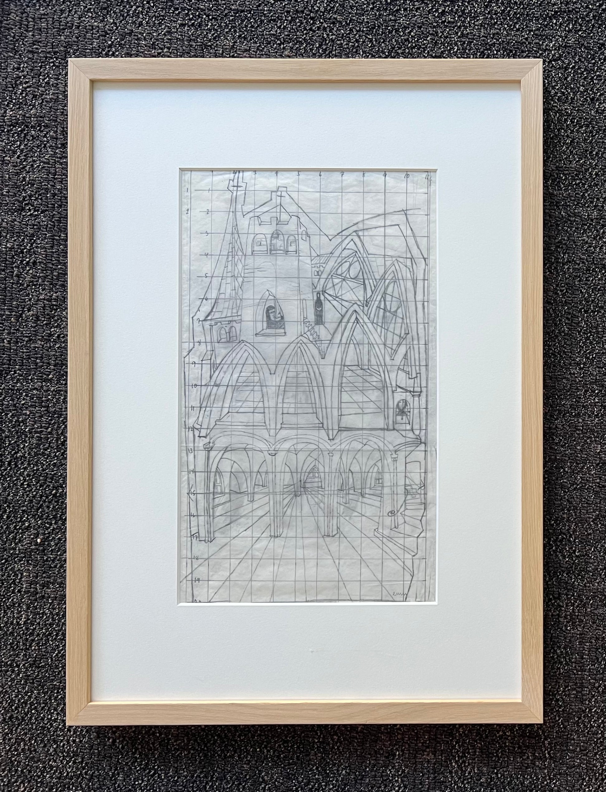 Egon Møller-Nielsen (1915-1959). “Klostret”, pencil on paper, signed. 40 x 23 (71 x 43) cm. Oakframe, museumglass.