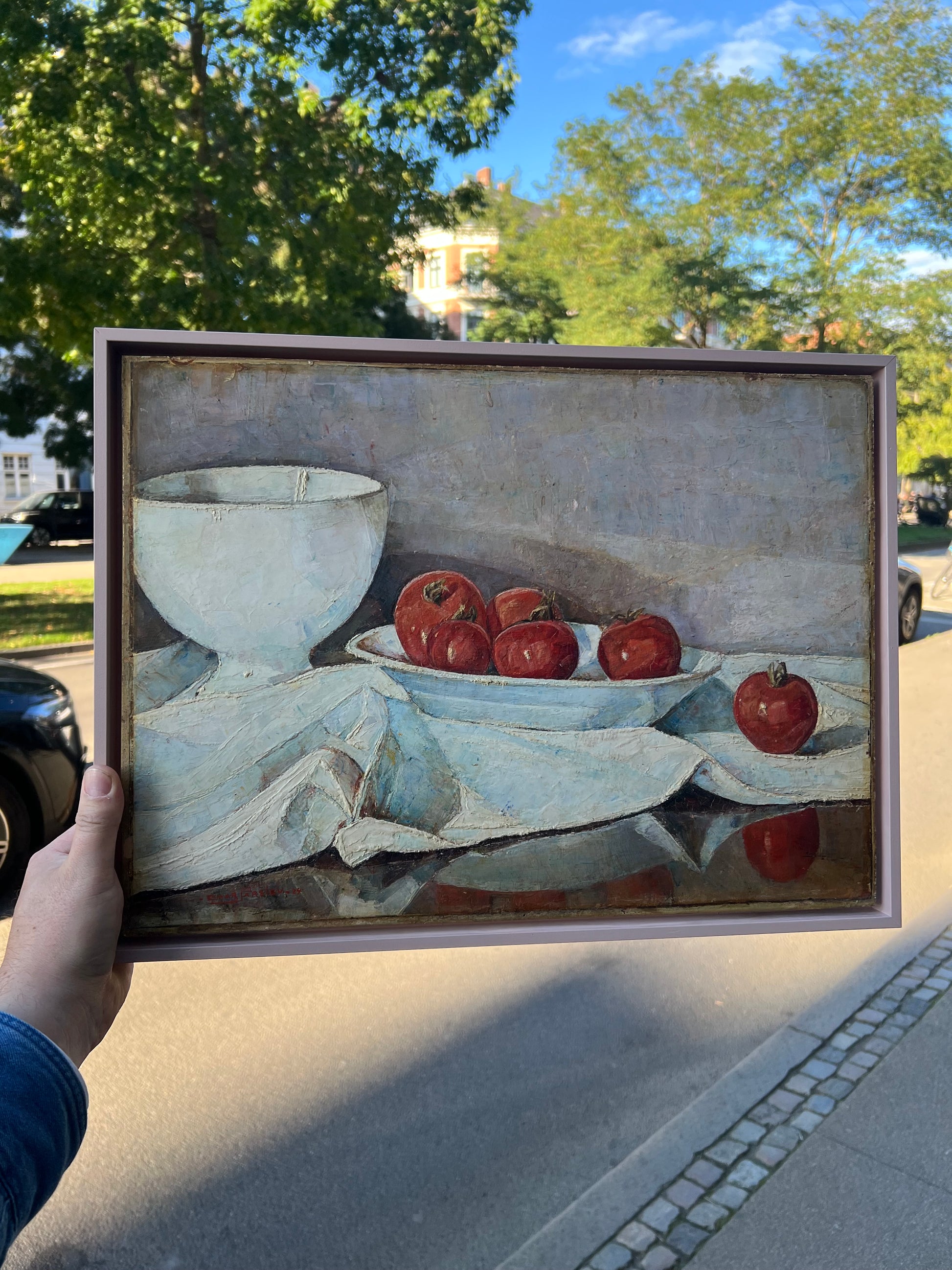 Einar Parslev (1891-1977). Stillife with tomatoes on a white tablecloth, oil on board, signed and dated 1924. 34 x 47 (37 x 51) cm. New handpainted wood frame.