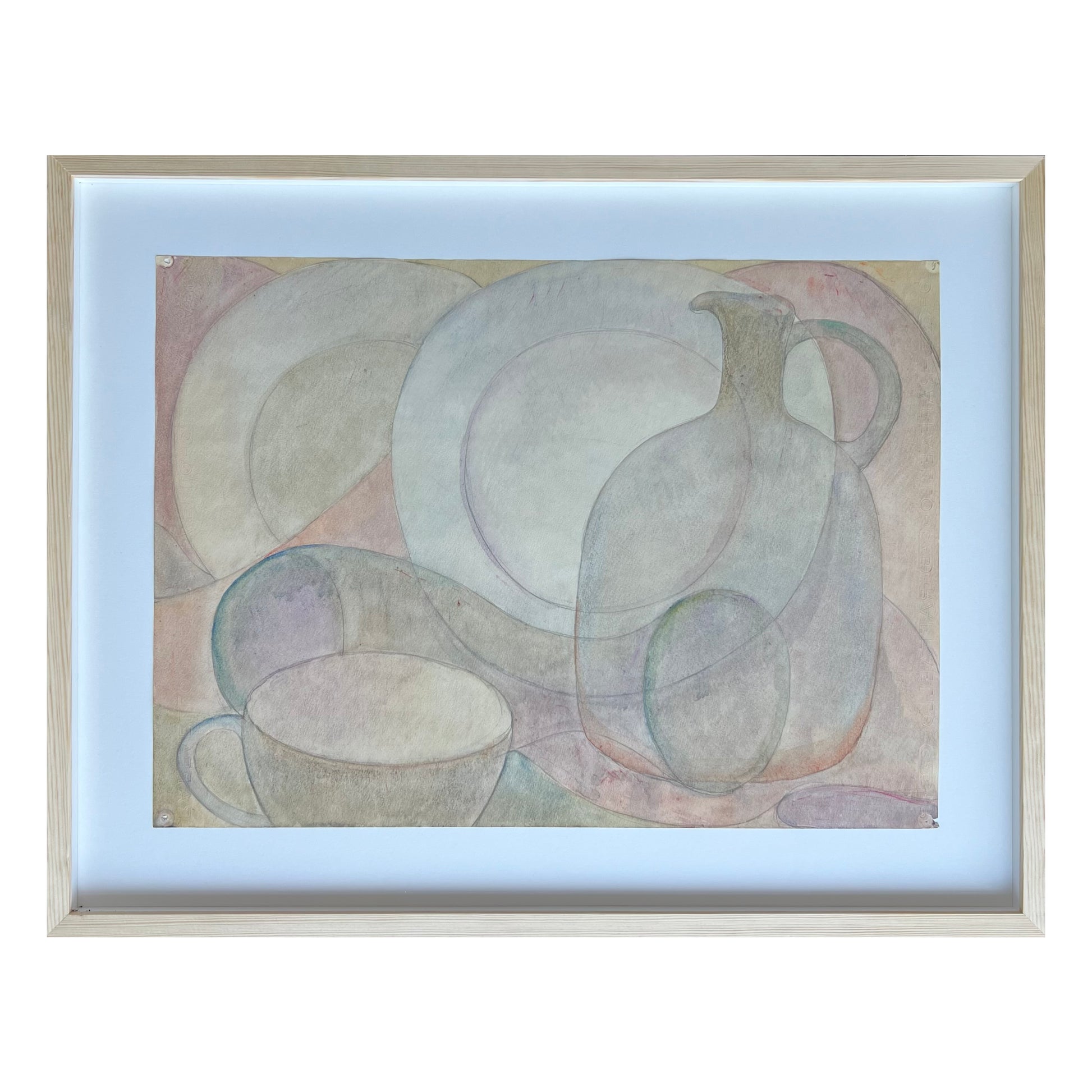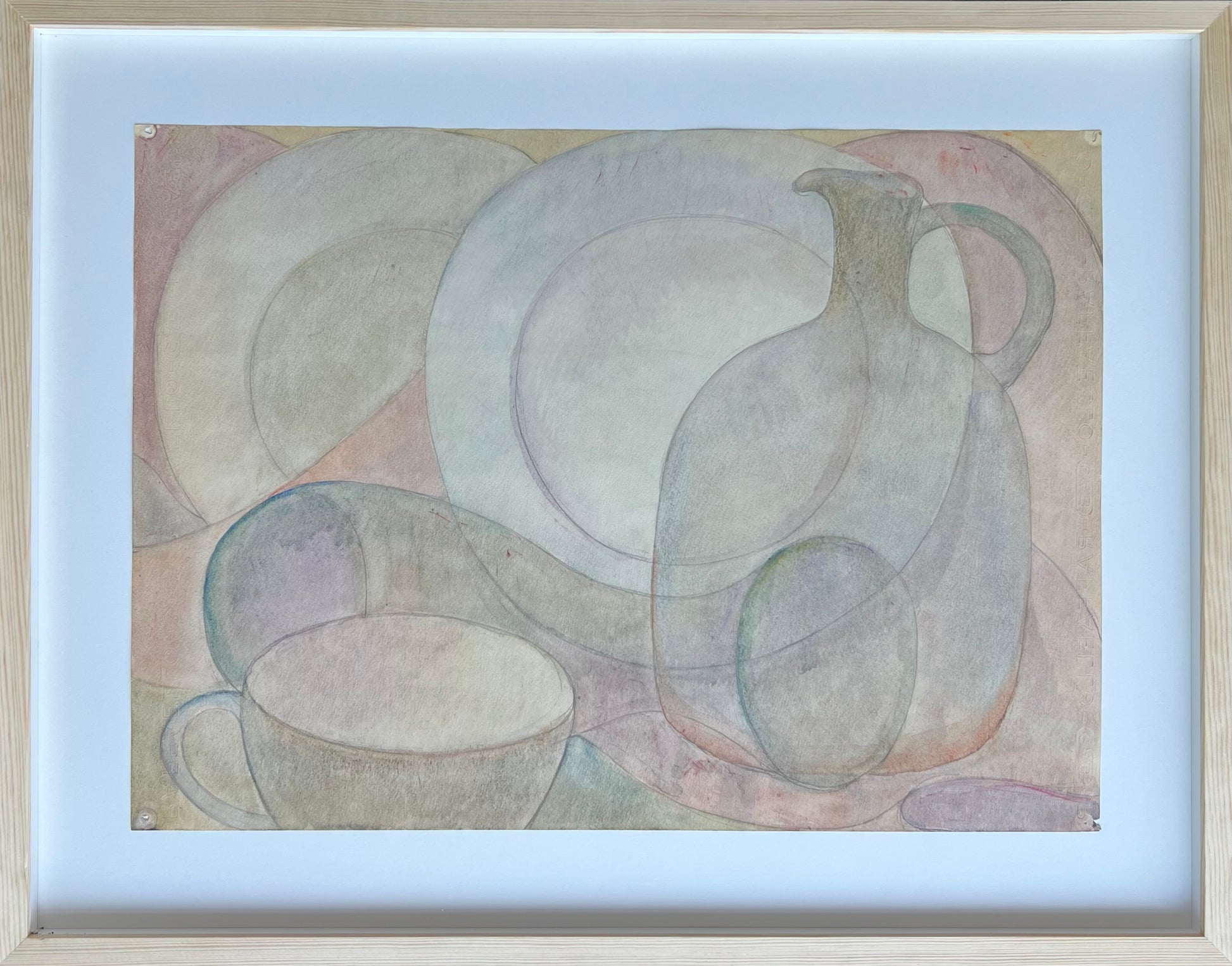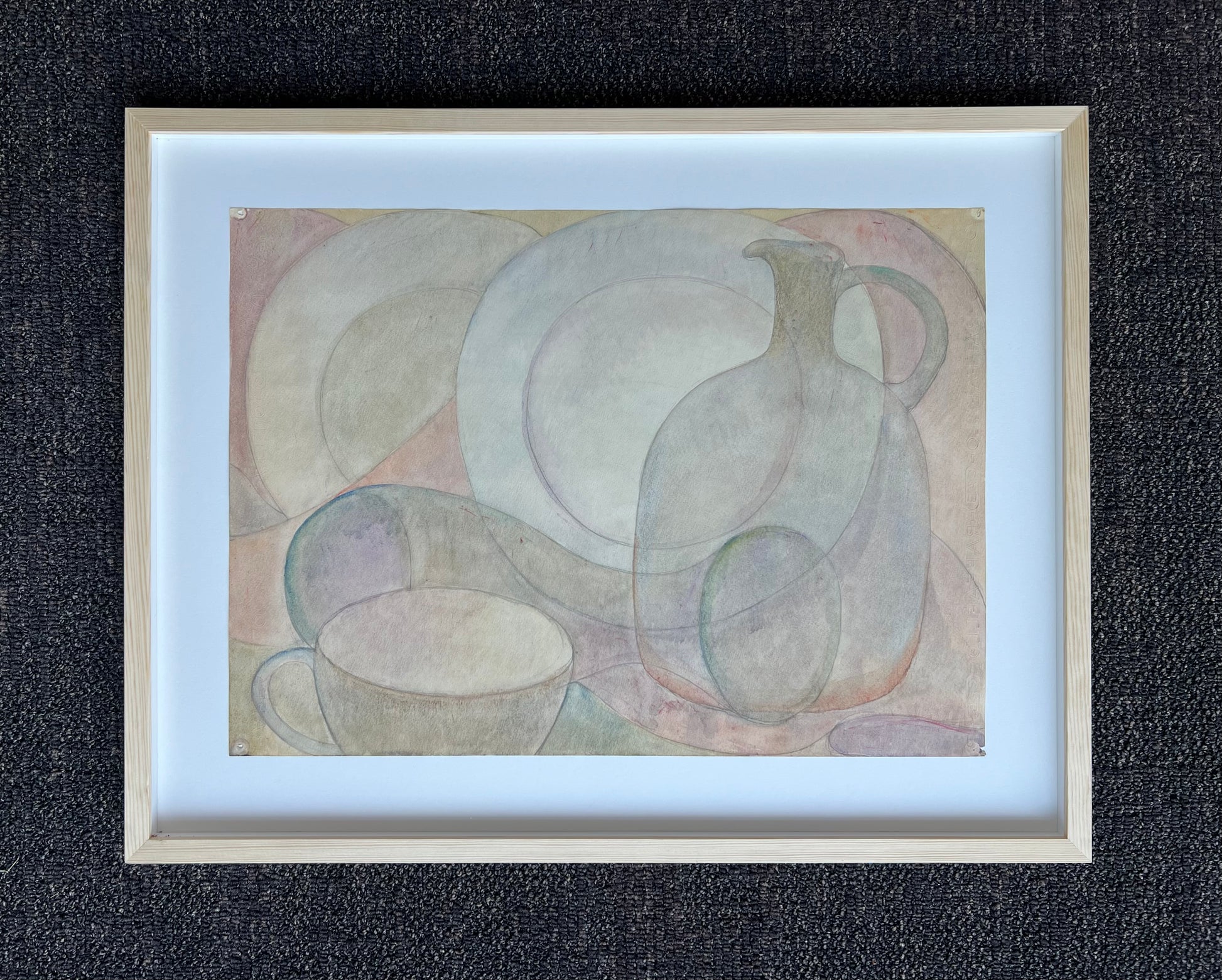 Elsa Nielsen (1923-2011). Bottles and plates, watercolour on paper, unsigned. 36 x 48 (48 x 60) cm.