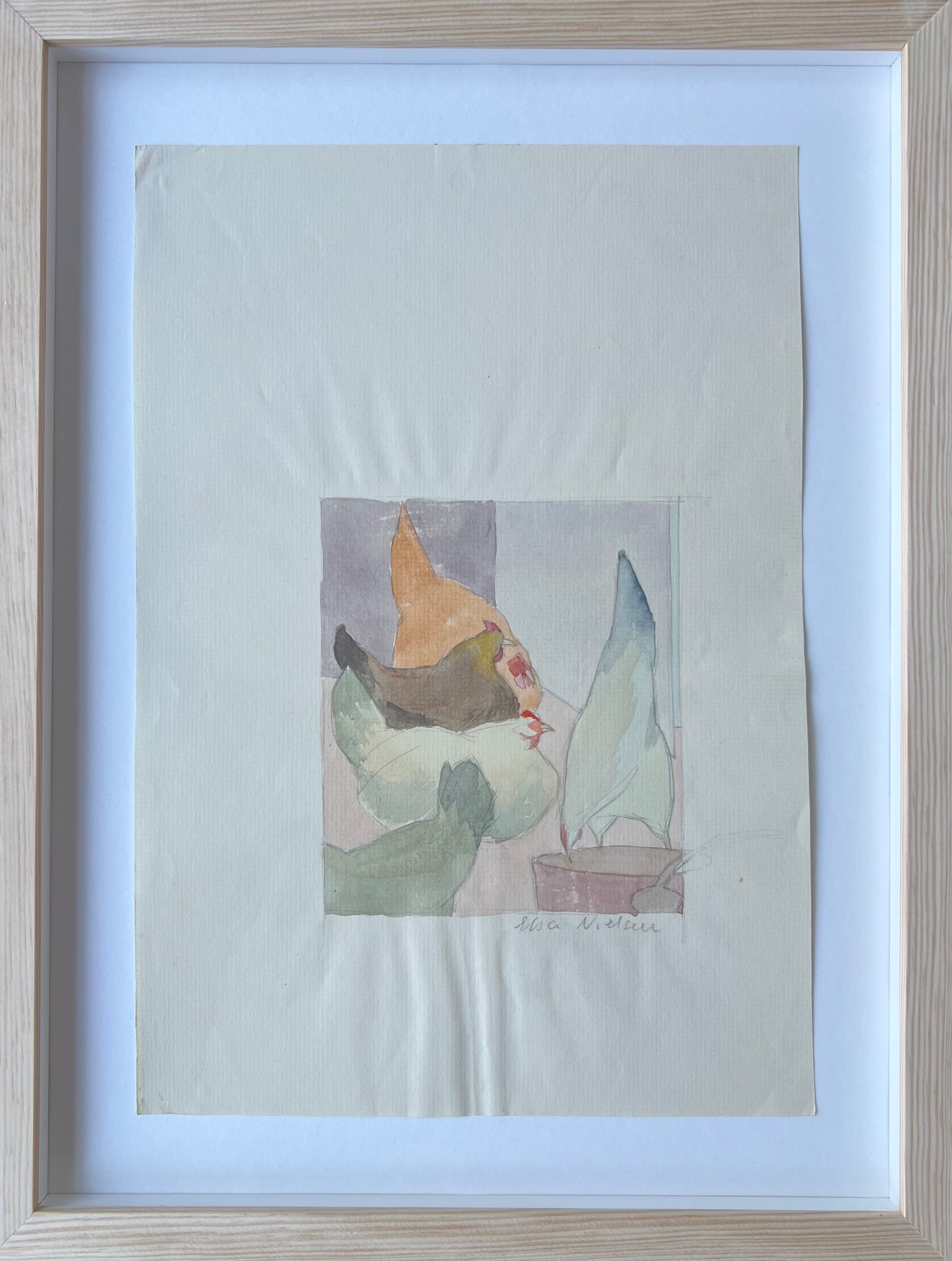 Elsa Nielsen (1923-2011). Composition with chicken, watercolour on paper, signed. 31 x 21 (40 x 29) cm. New pine frame, museumglass.