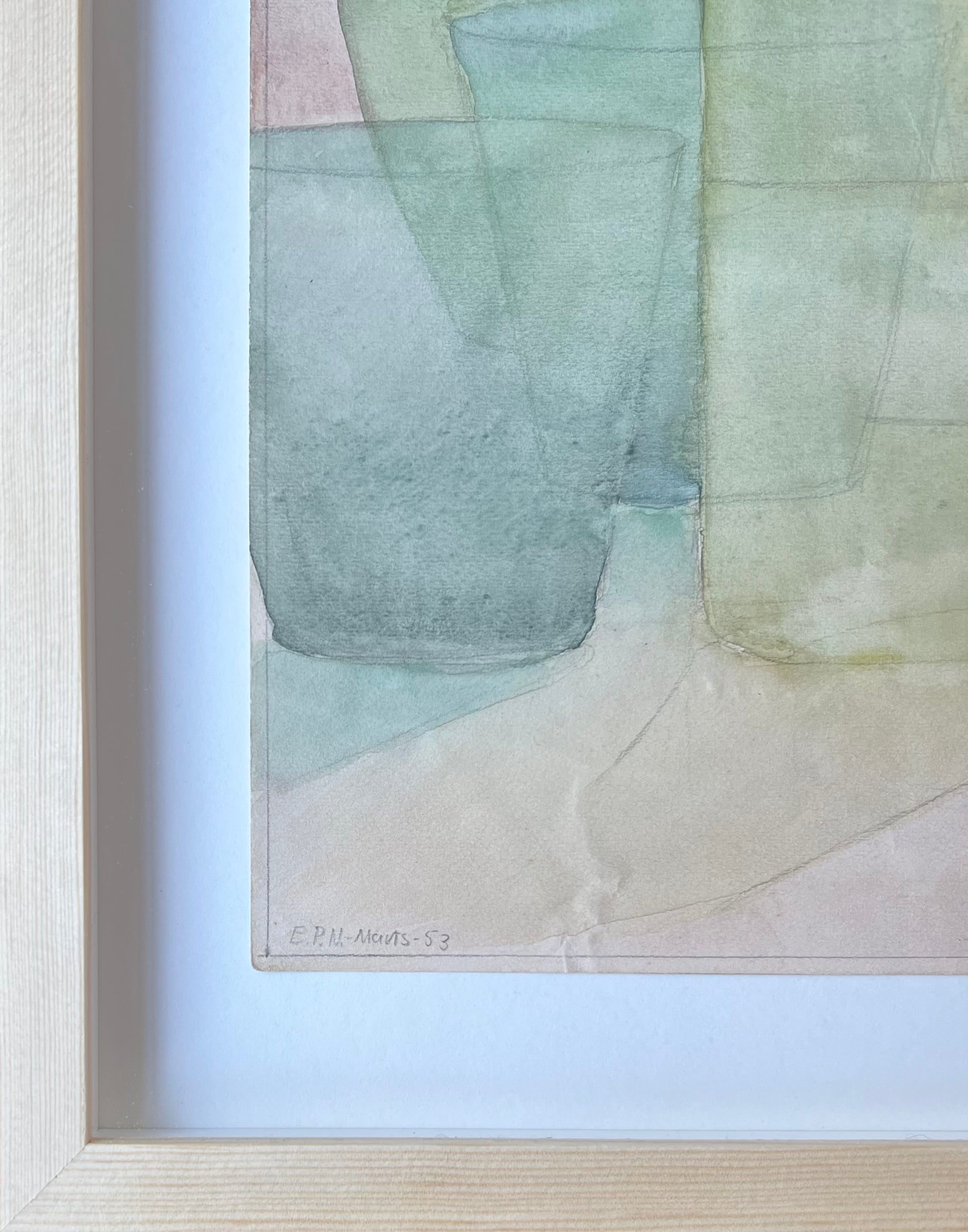 Elsa Nielsen (1923-2011). Stillife with bottles, watercolour on paper, signed and dated. 42 x 30 (51 x 38) cm. New pine frame, museumglass.