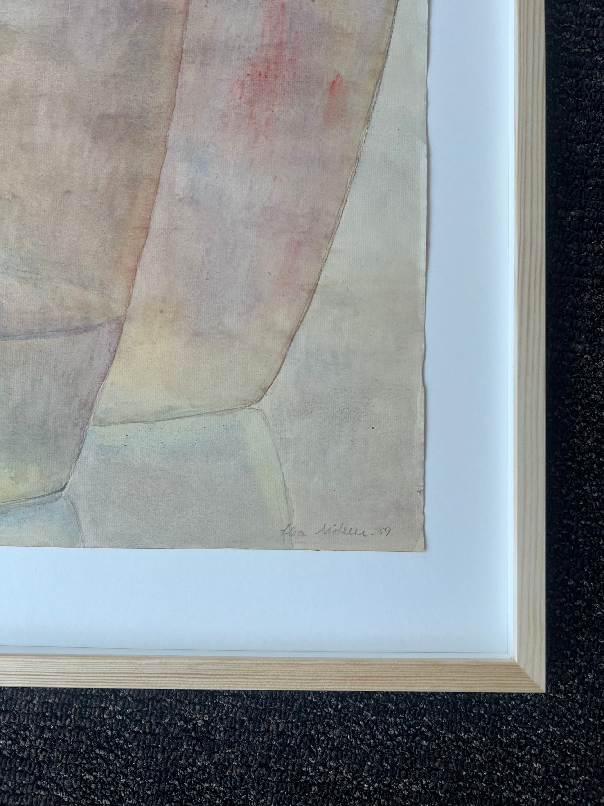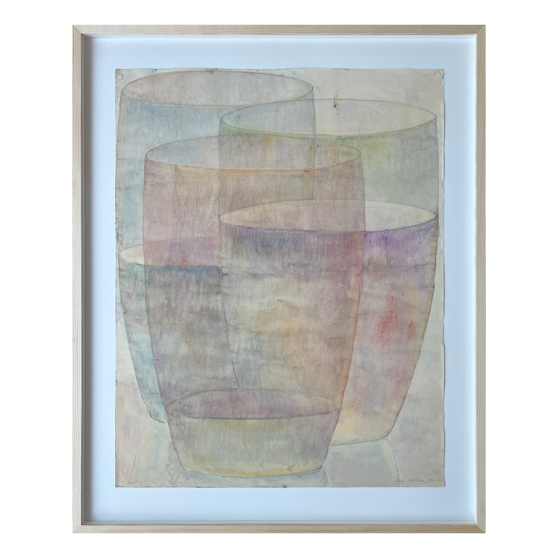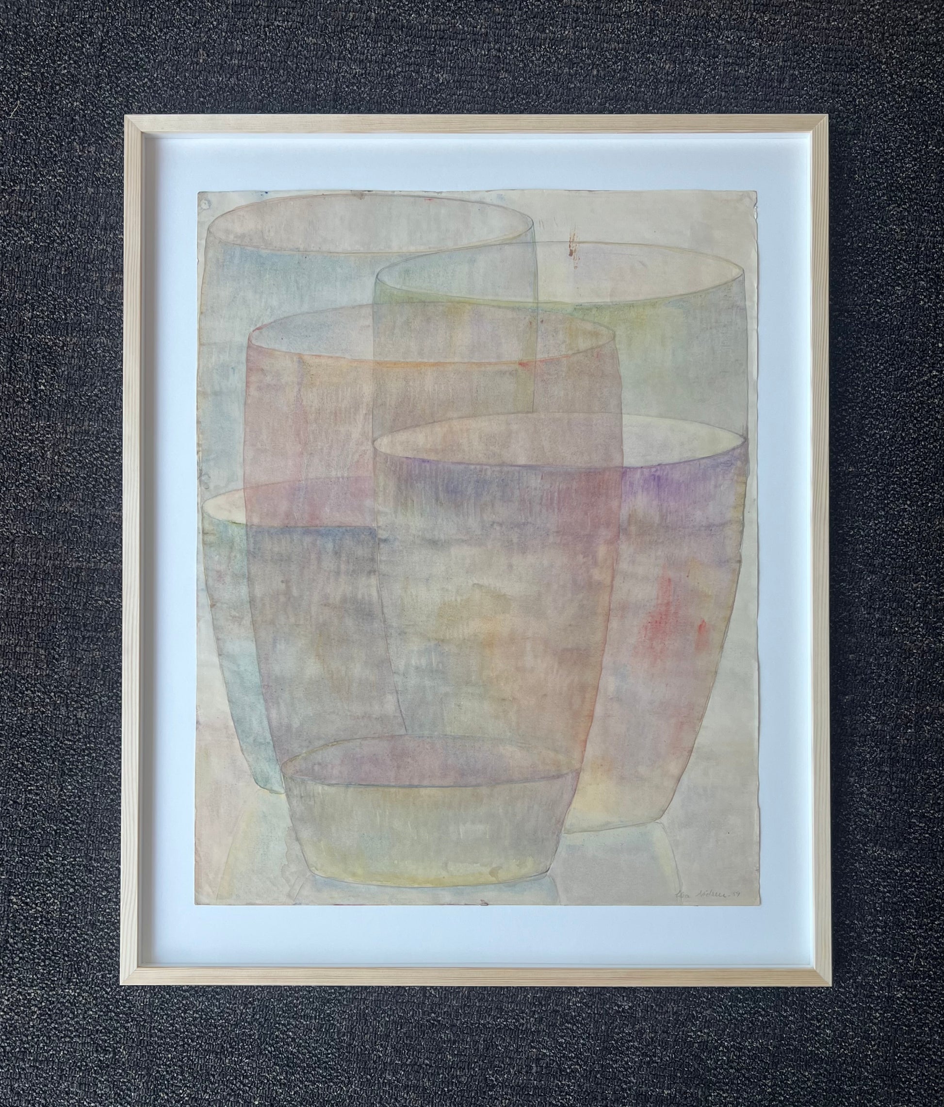 Elsa Nielsen (1923-2011). Three glasses, watercolour on paper, signed and dated 1959. 64 x 50 (78 x 63) cm. New pine frame, museumglass.