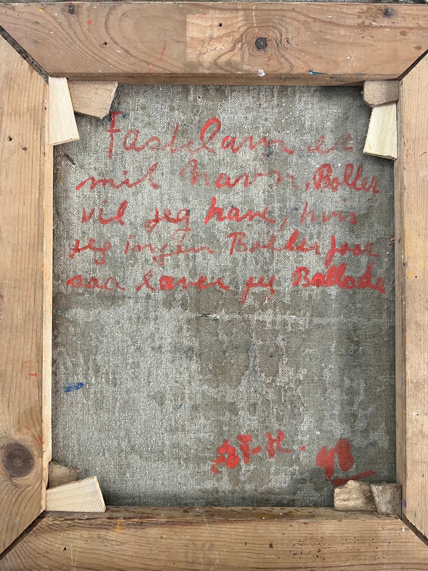 Inscribed on the back “Fastelavn er mit navn boller vil jeg have hvis jeg ingen boller faar så laver jeg ballade”.