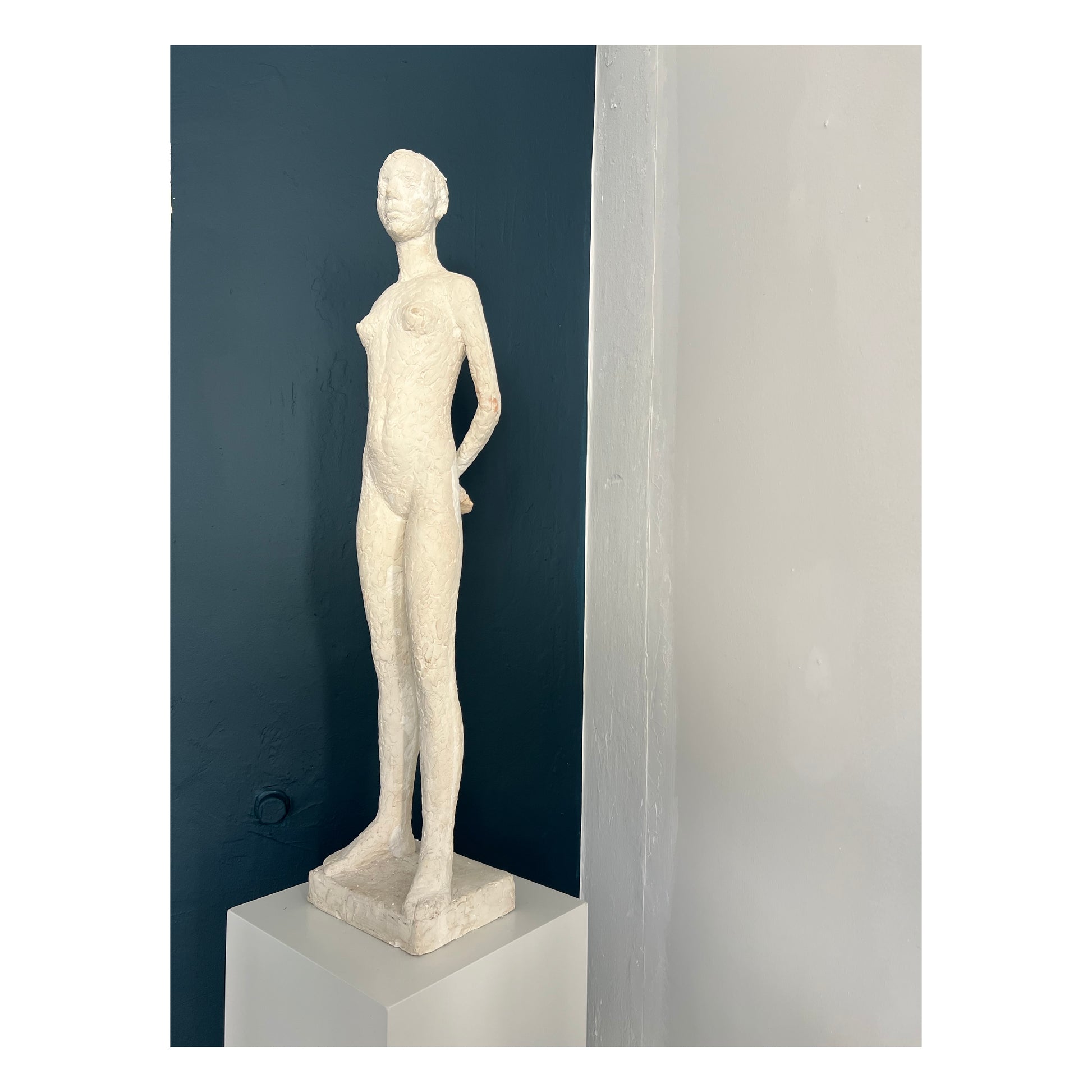 Hanne Varming (1939-2022). Full figure portrait, sculpture of plaster. Signed. H. 92 cm. Some wear and small repairs.