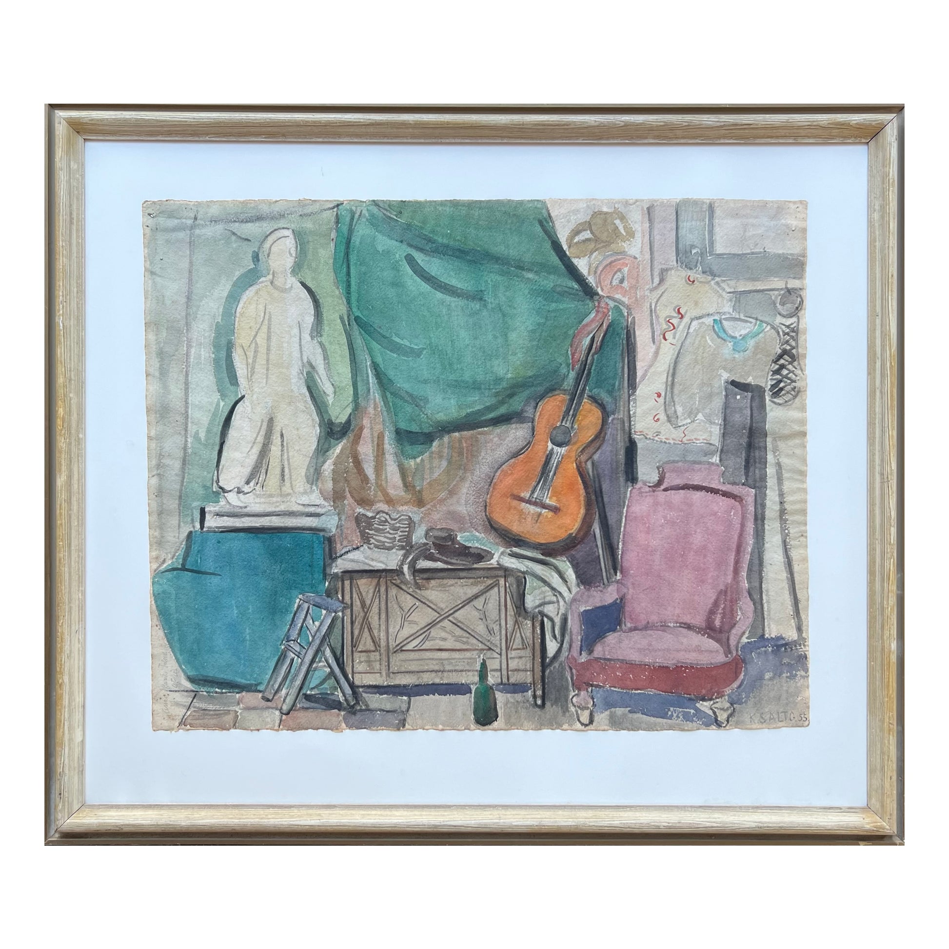 Kamma Salto (1890-1979). “Anne Marie Telmányis atelier”, watercolour on paper, signed and dated 1955. 50 x 62 (69 x 79 cm. New frame with museumglass.