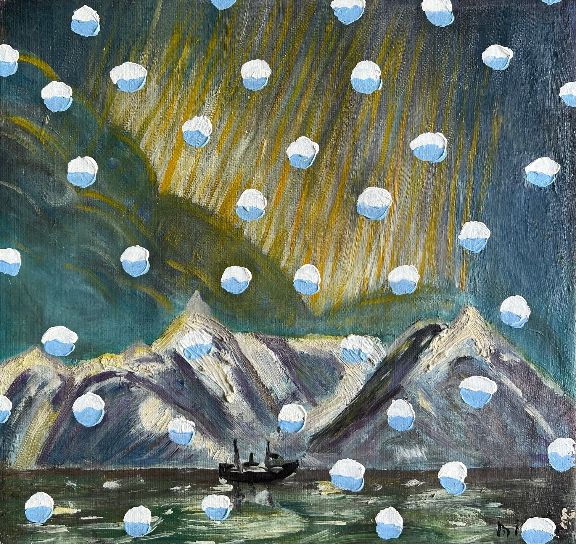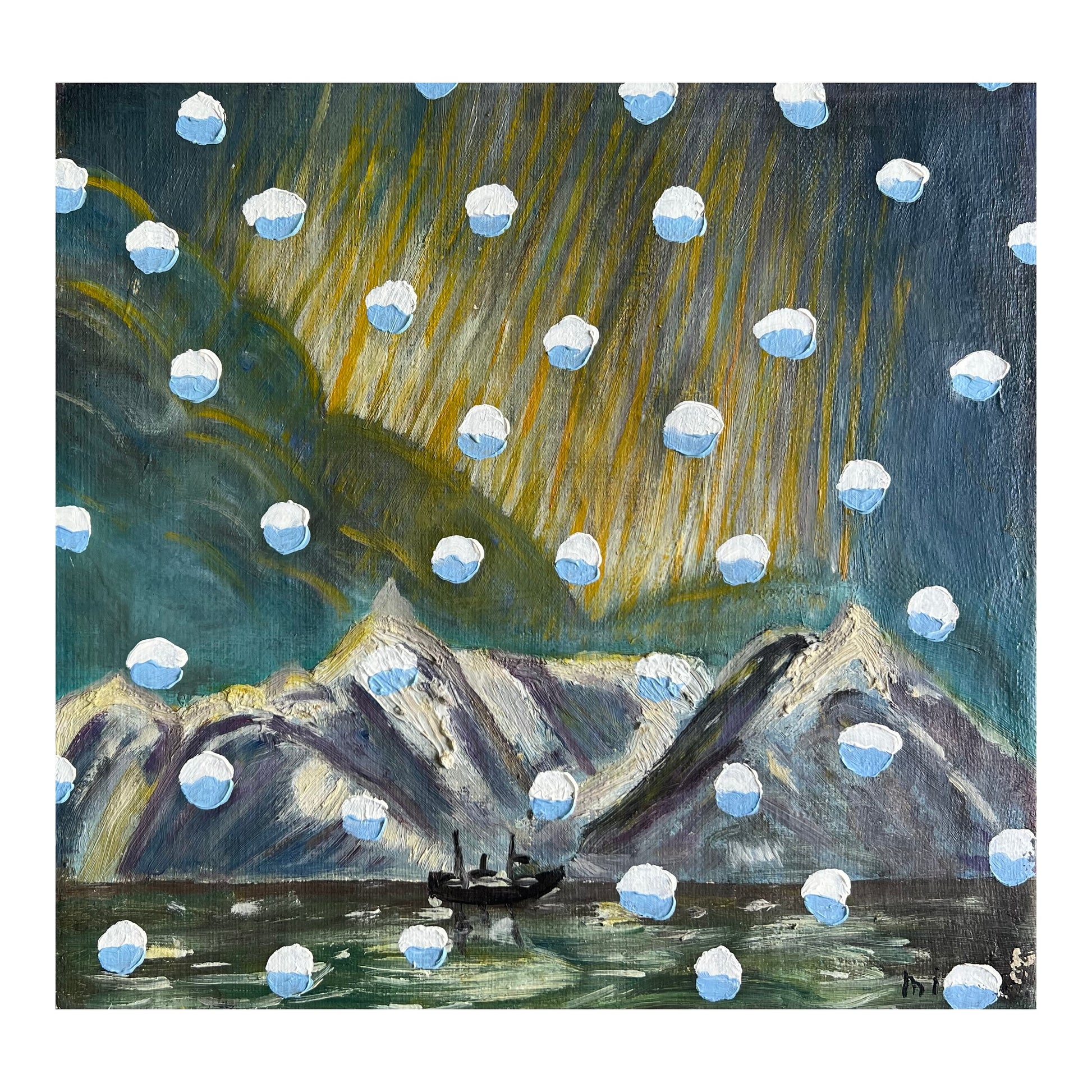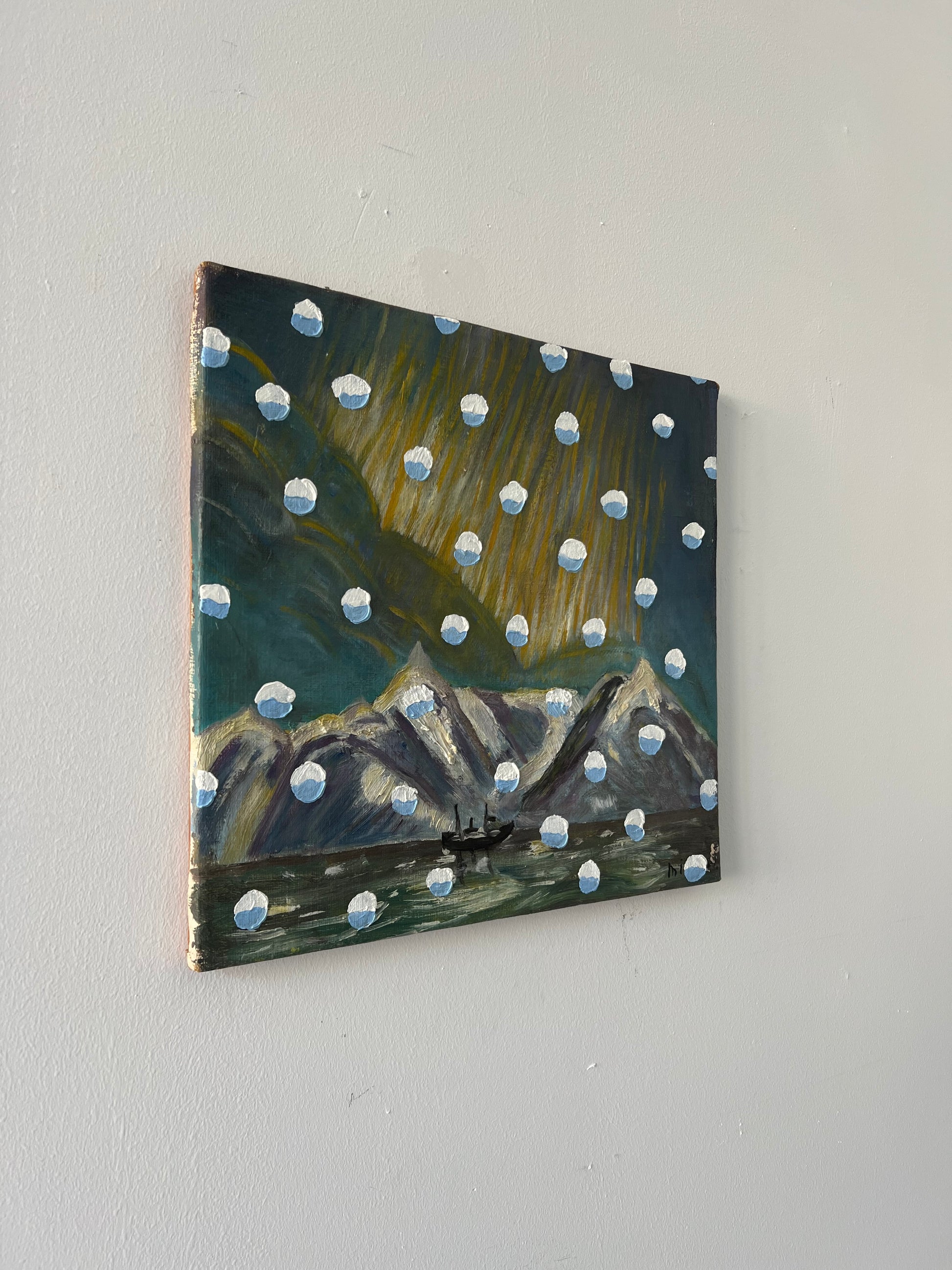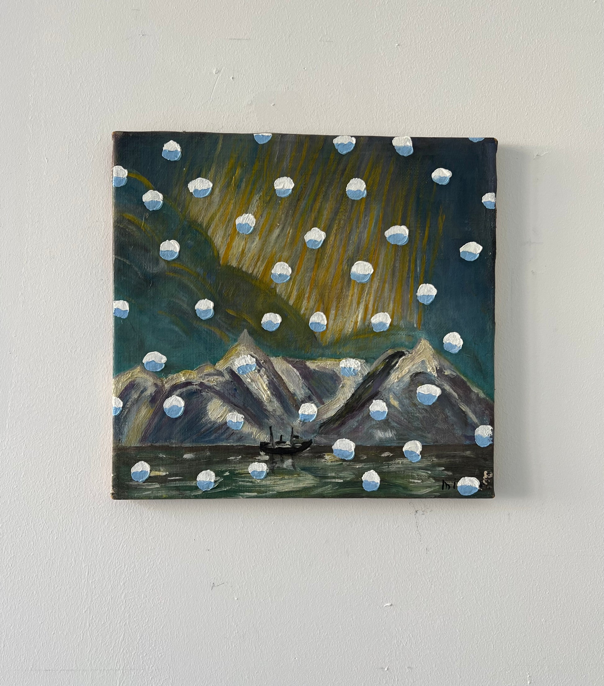 Mads Lindberg (b. 1984). Untitled, (Snowpainting), oil on found painting, signed on the back. 36 x 38 cm.
