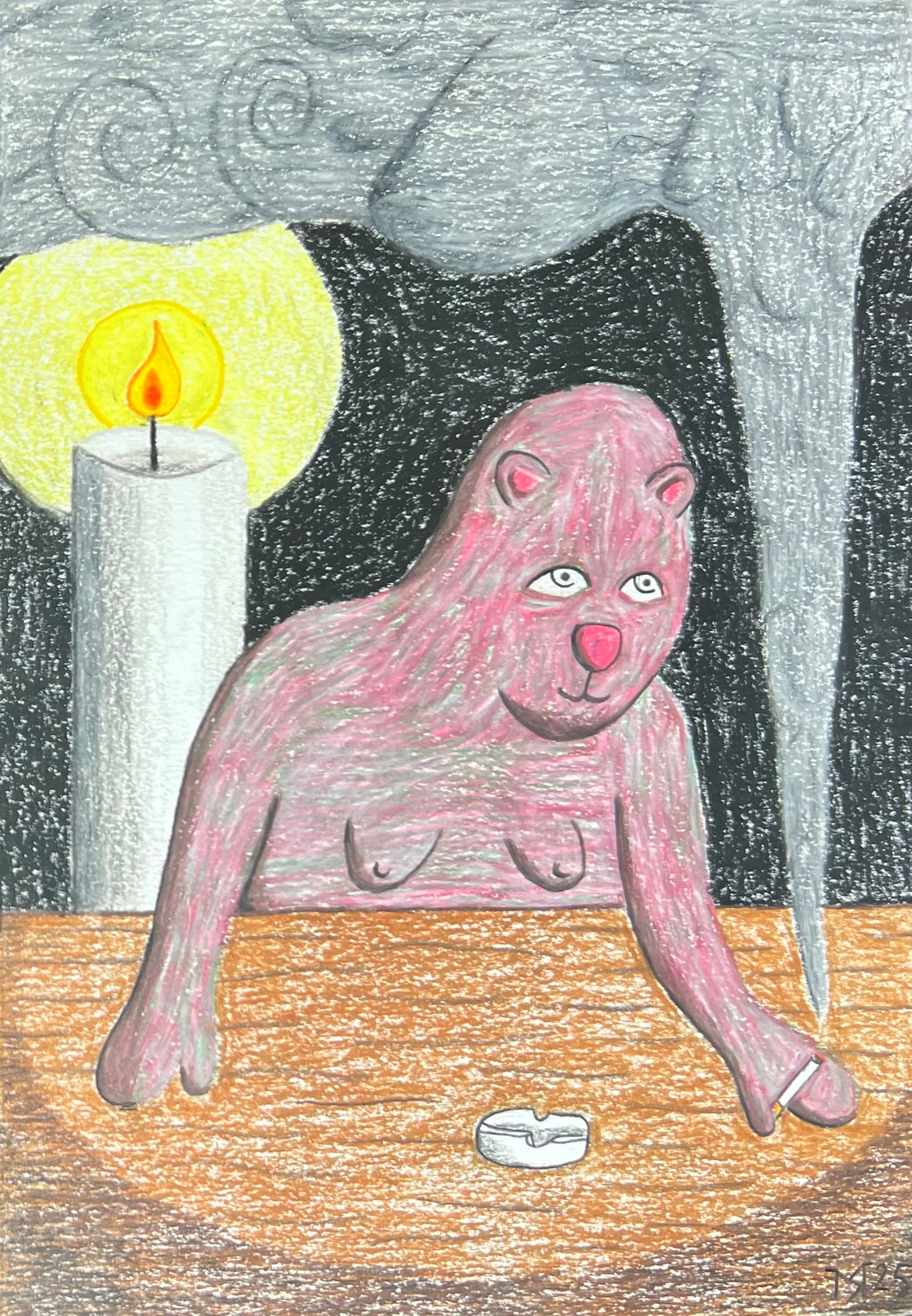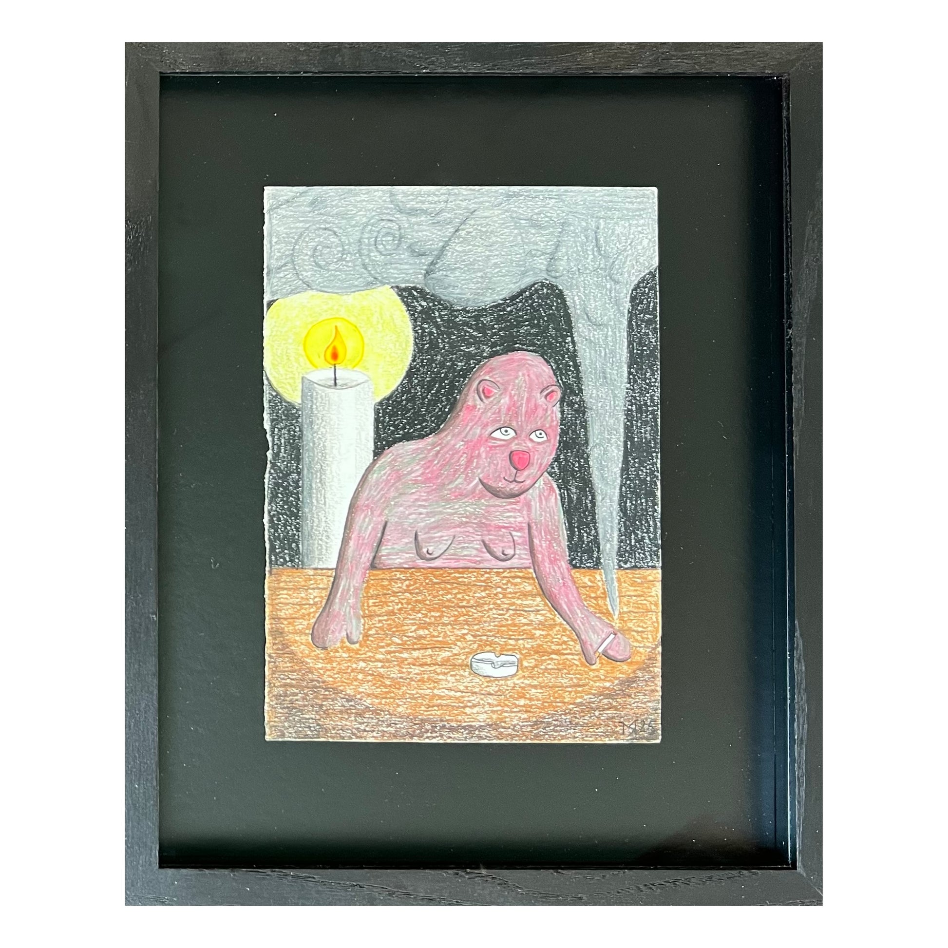 Mette Rasmussen (b. 1993). “Bamse Rasmussen ryger indenfor”, colored pencil on paper, signed and dated 2025. 21 x 15 (32 x 26) cm. New handpainted wood frame, museumglass.