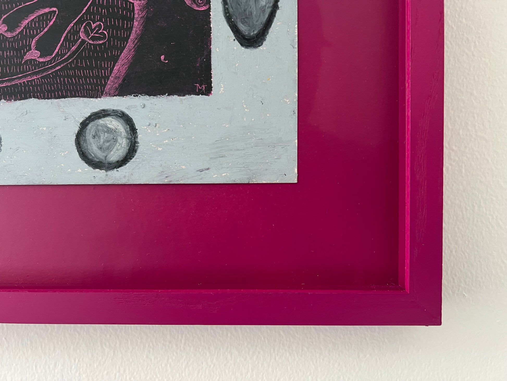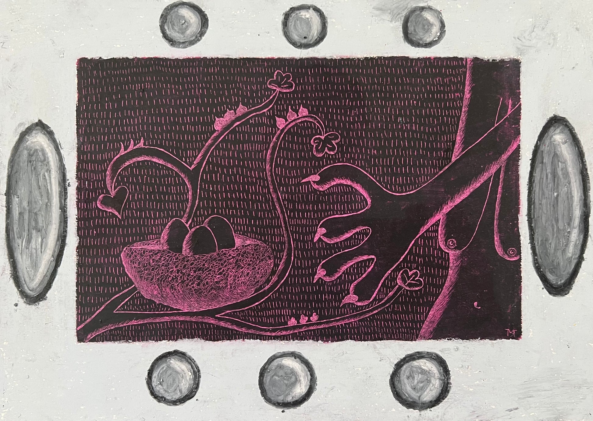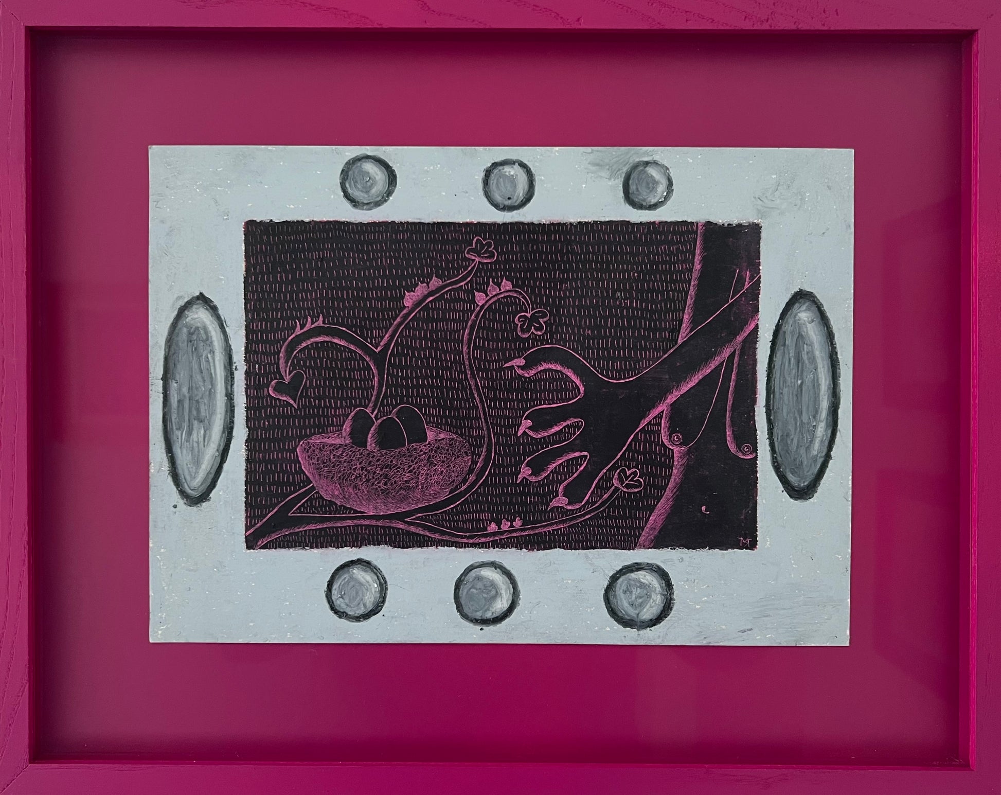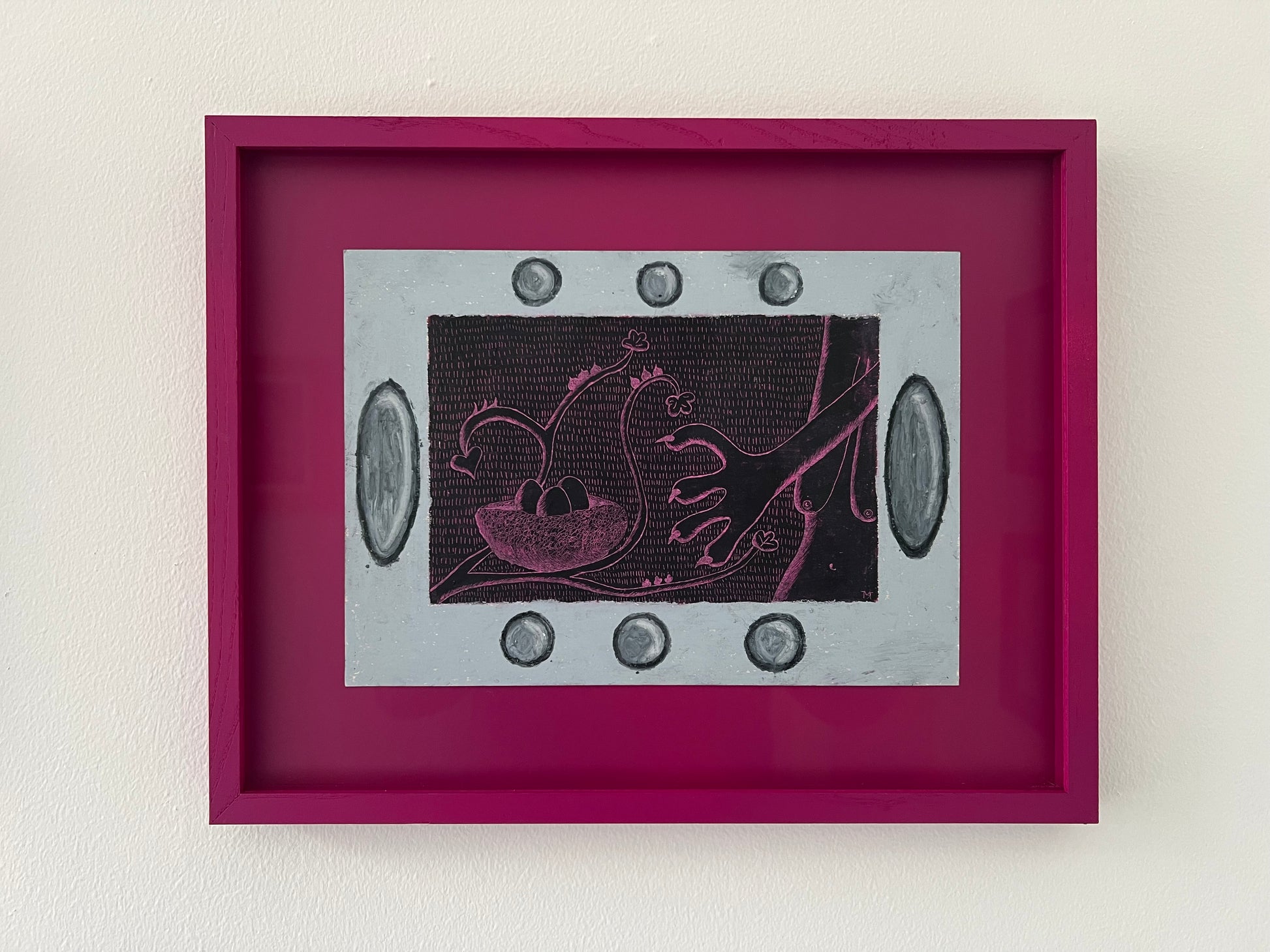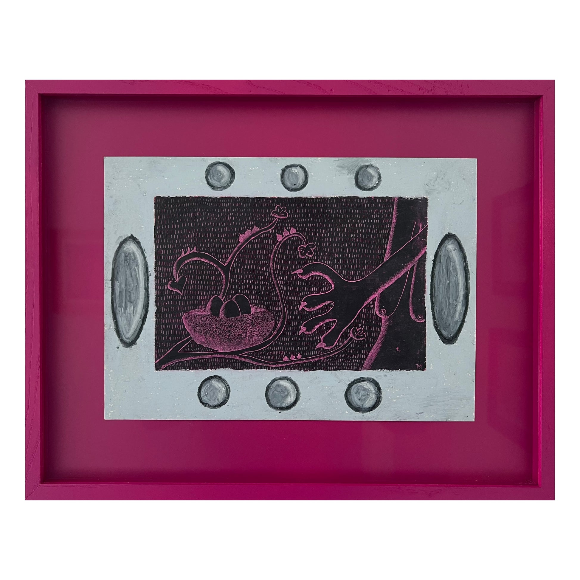 Mette Rasmussen (b. 1993). “Psykoterapeutens æg”, oilchalk on paper, signed. 20 x 29 (32 x 42) cm. New handpainted wood frame, museumglass.