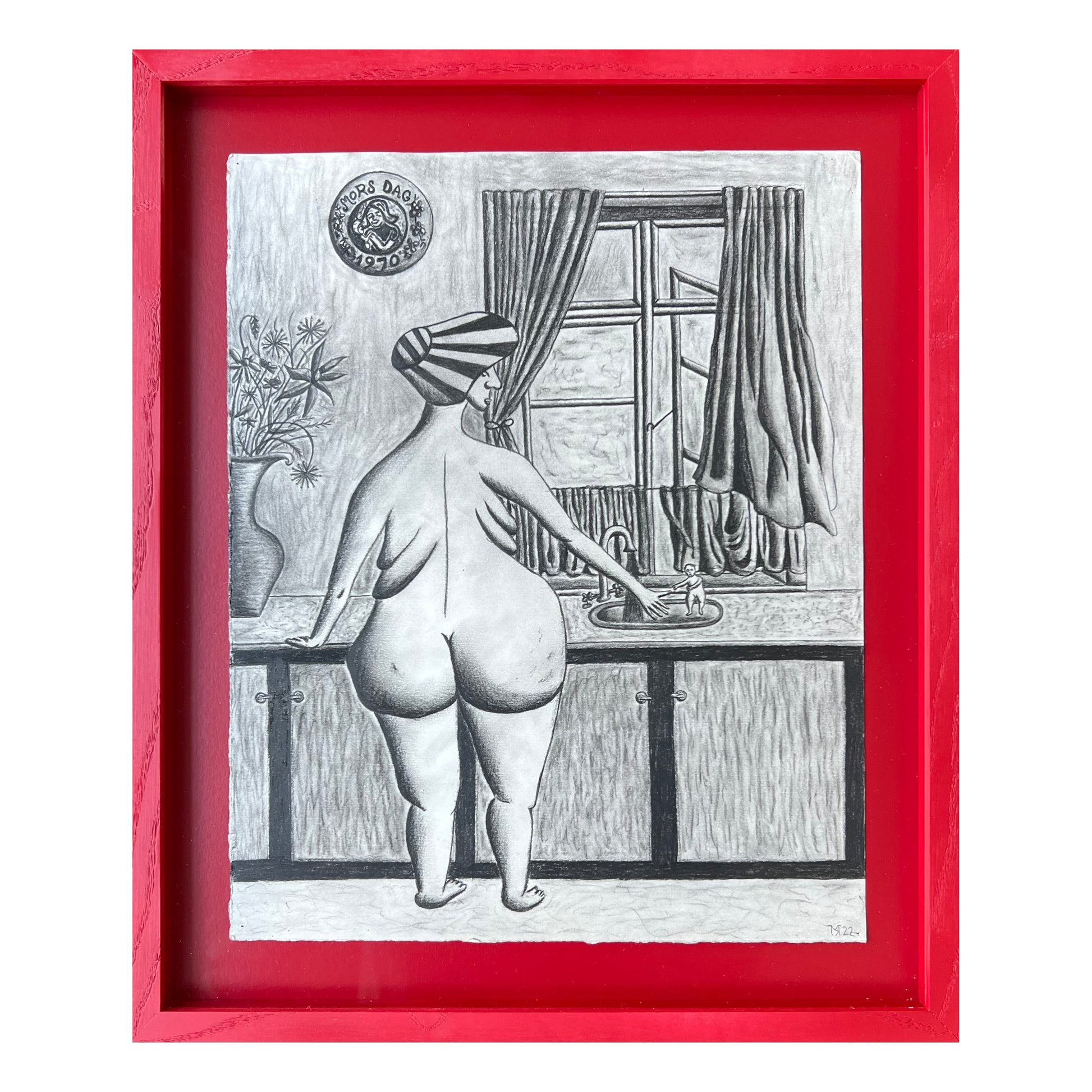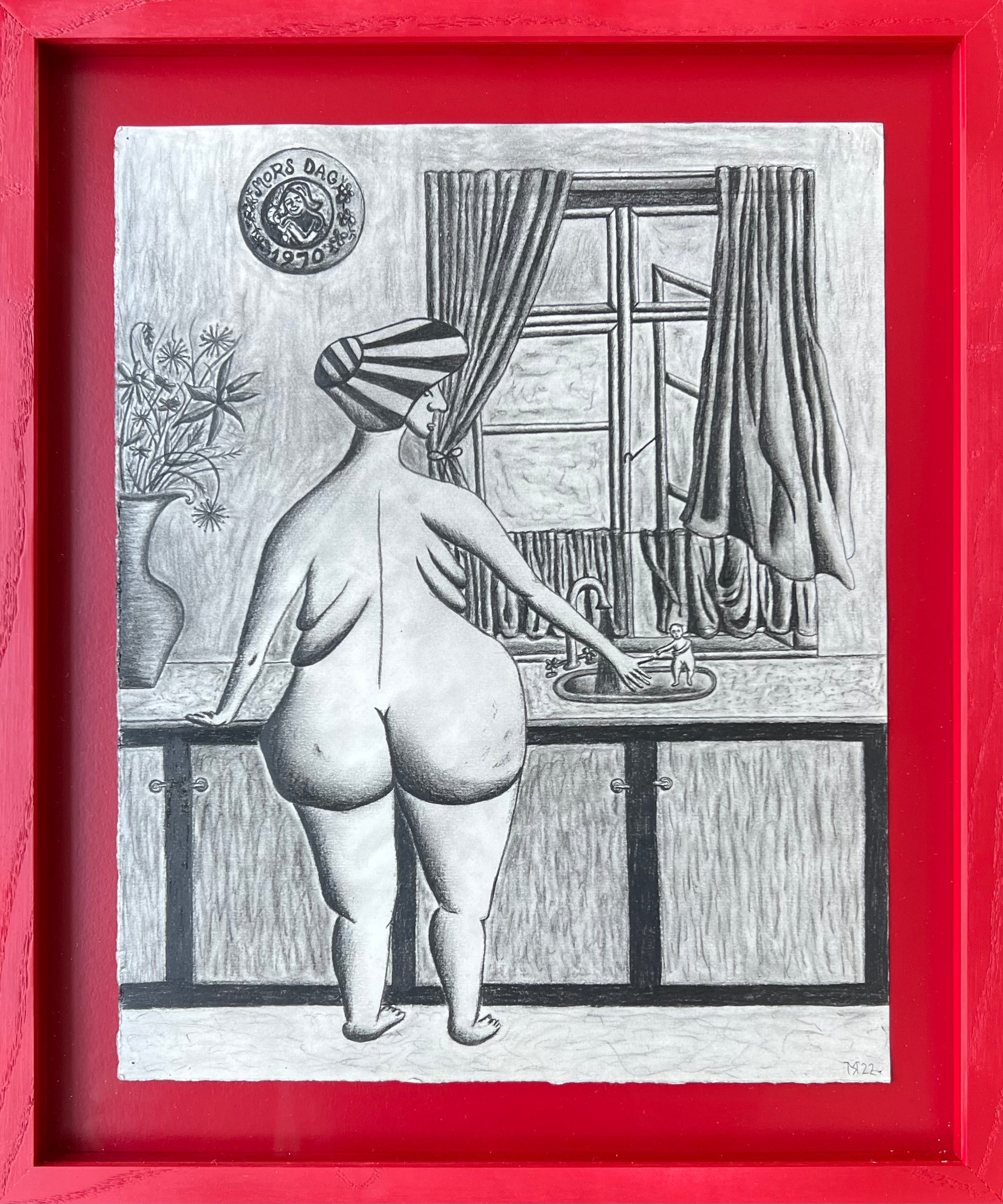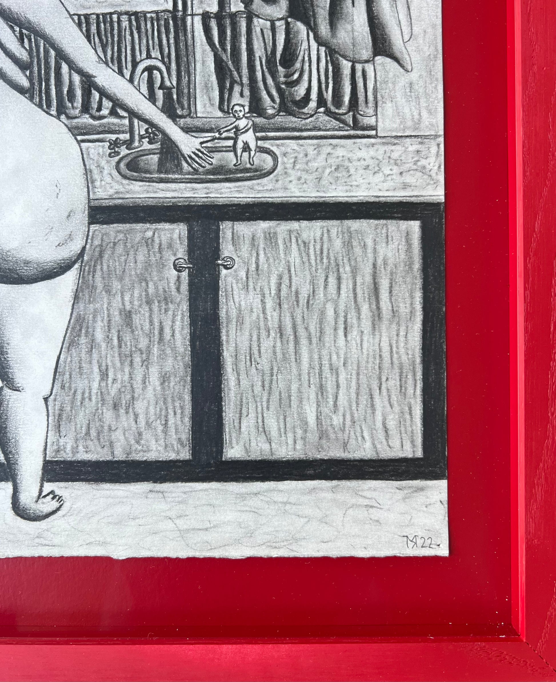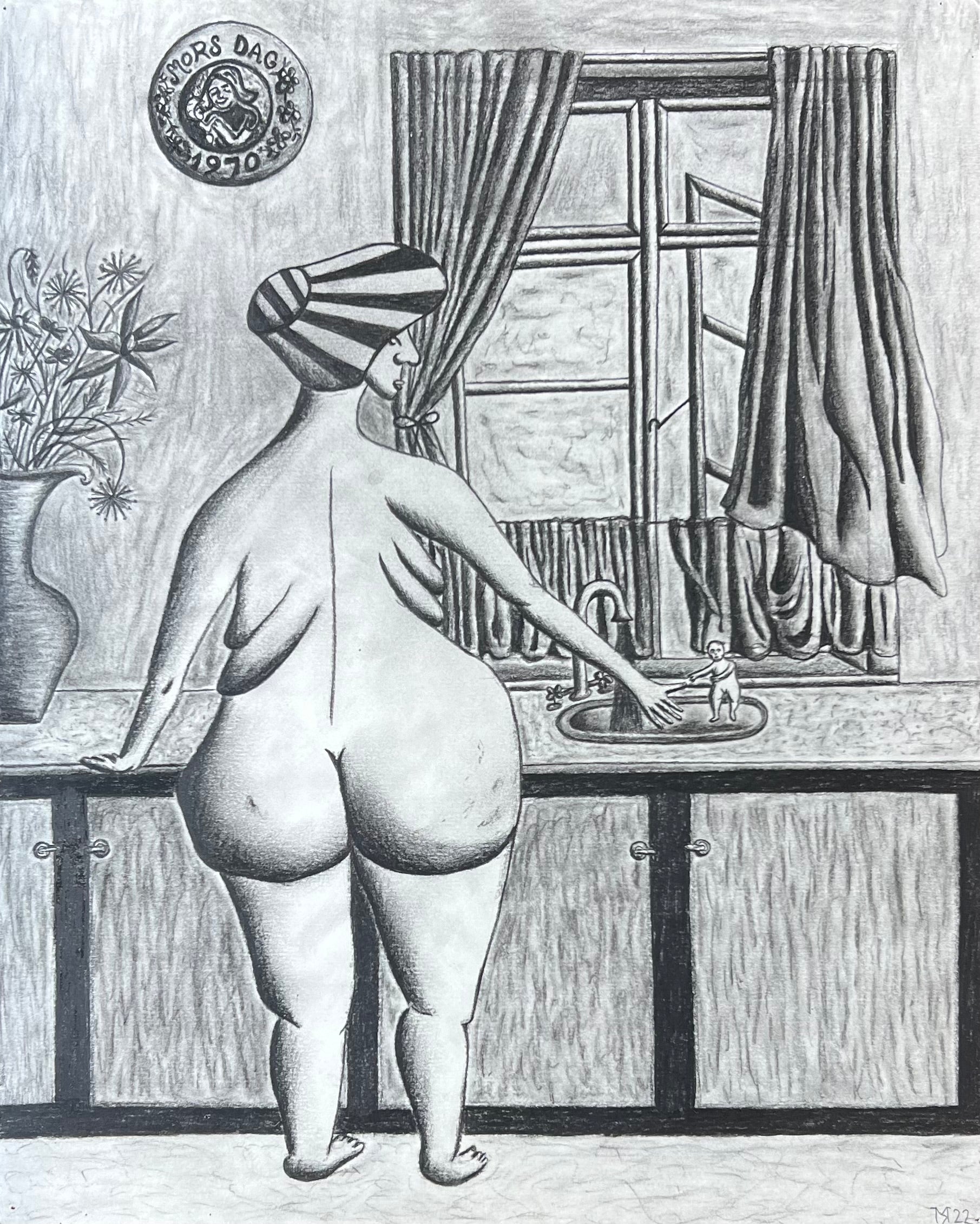 Mette Rasmussen (b. 1993). “Vaskedag”, charcoal on paper, signed and dated 2022. 37 x 29 (46 x 38) cm. New handpainted wood frame, museumglass.