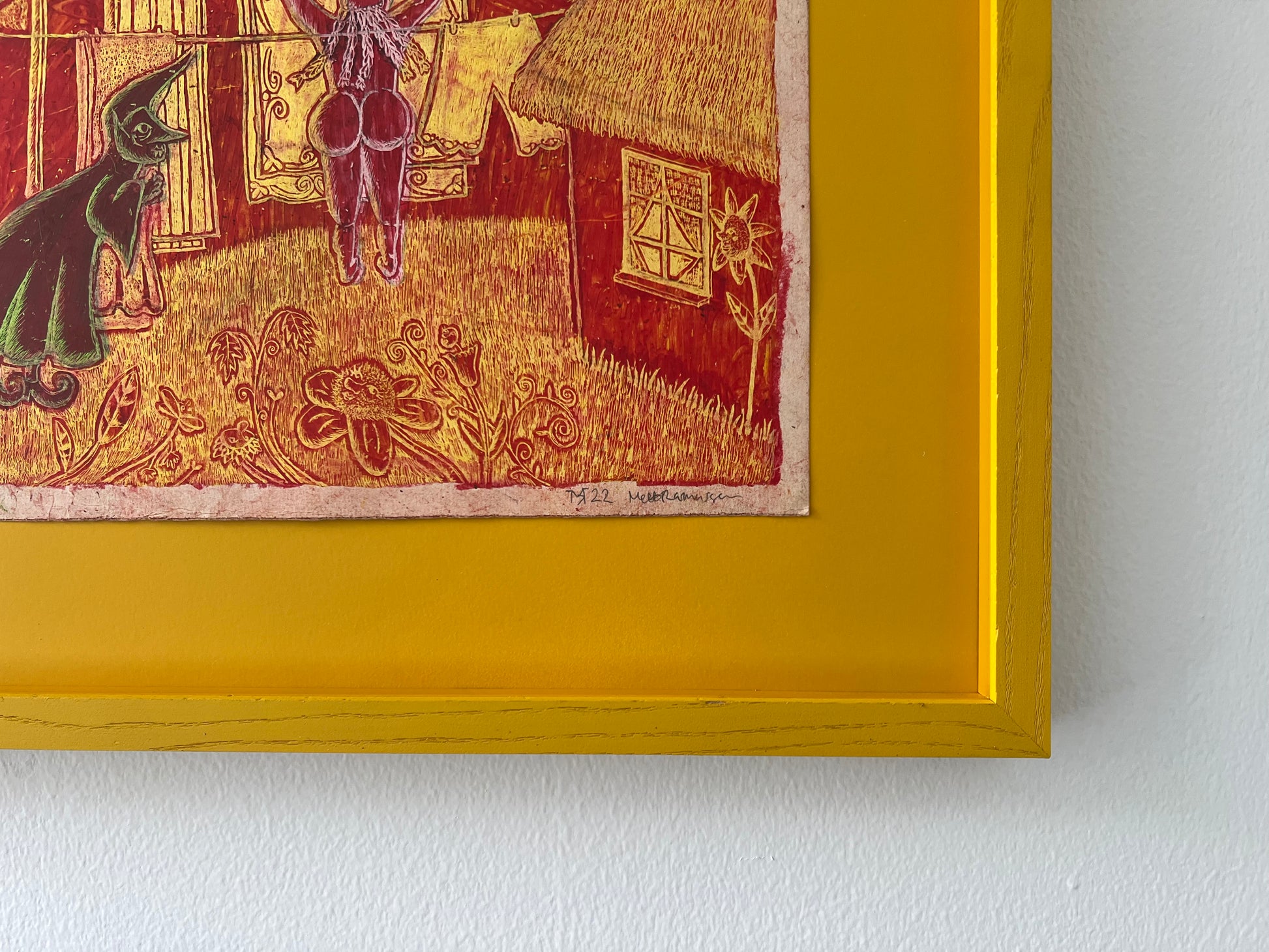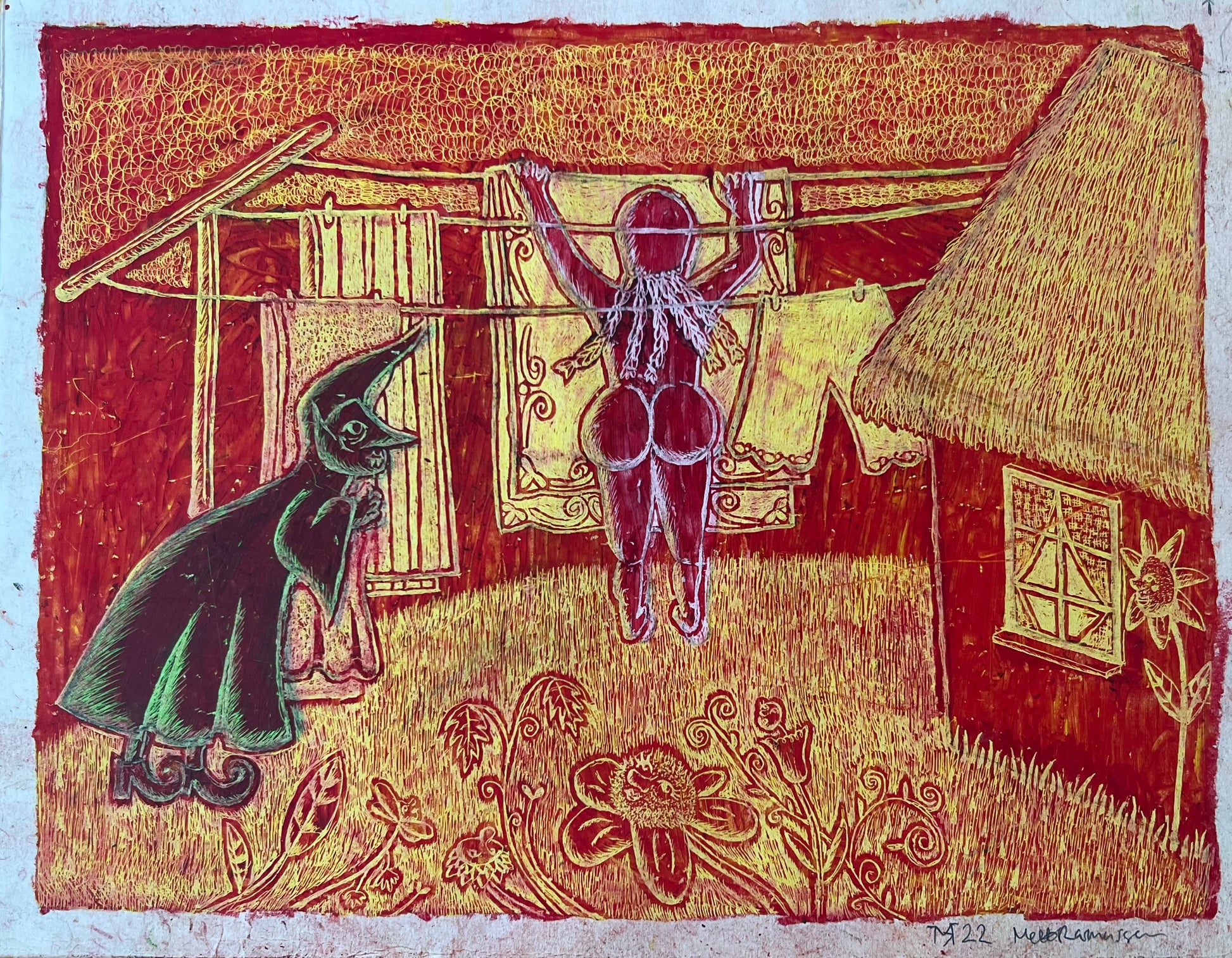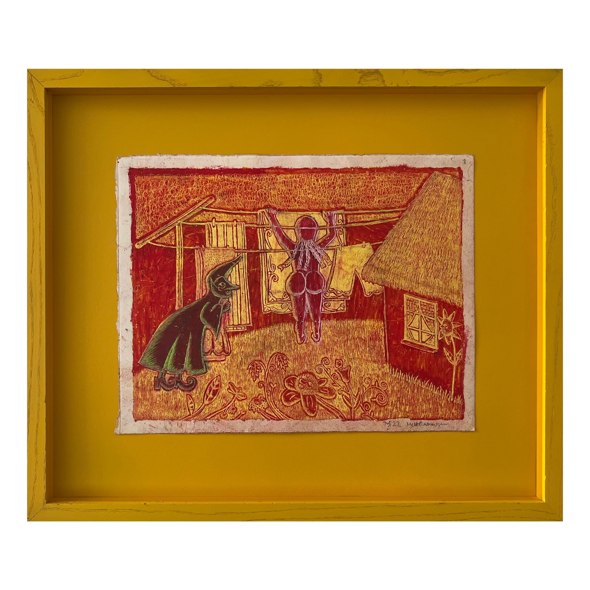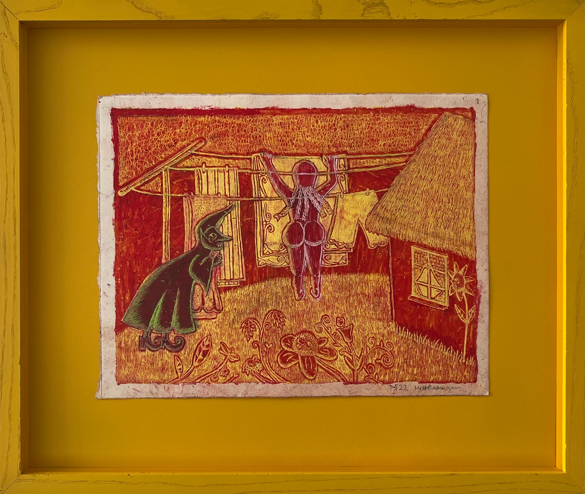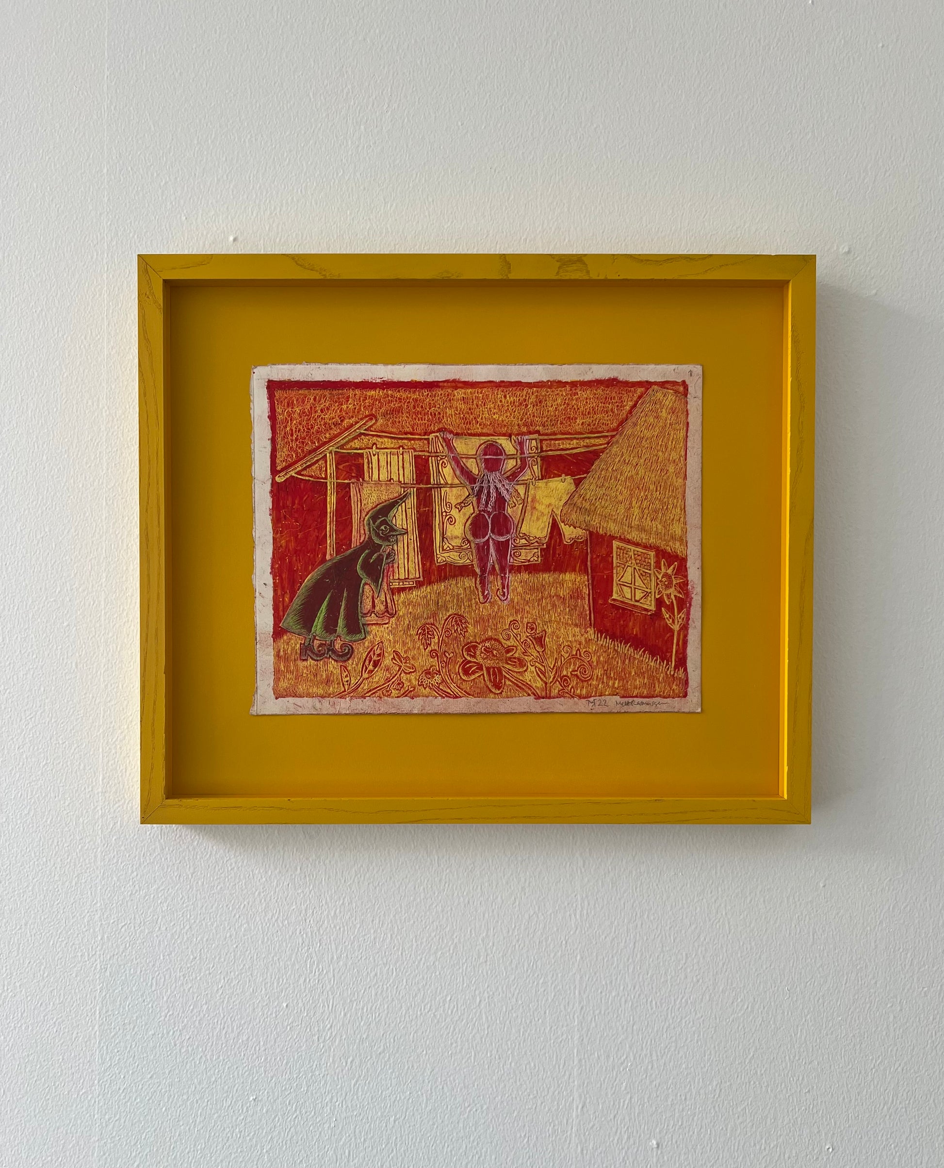 Mette Rasmussen (b. 1993). “Vasketøj”, oilchalk on paper, signed and dated 2022. 20 x 26 (32 x 38) cm. New handpainted wood frame, museumglass.