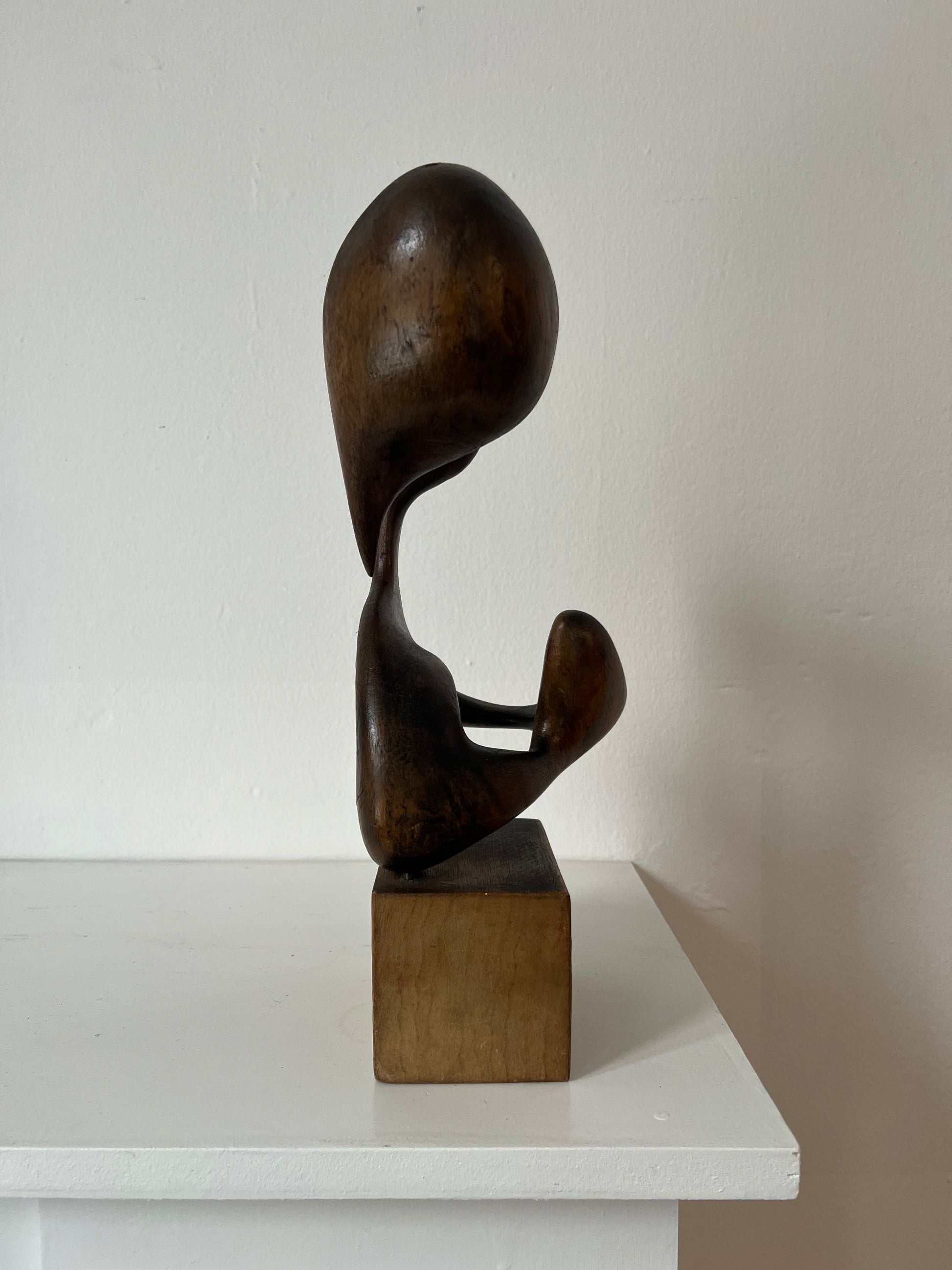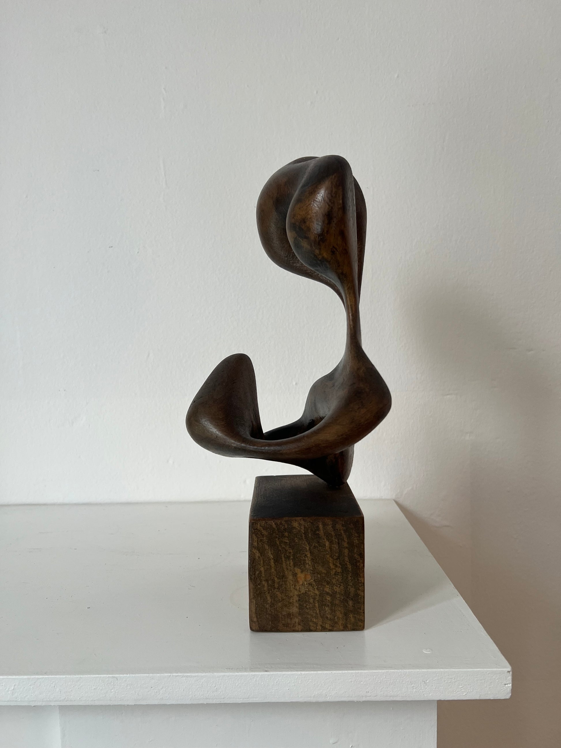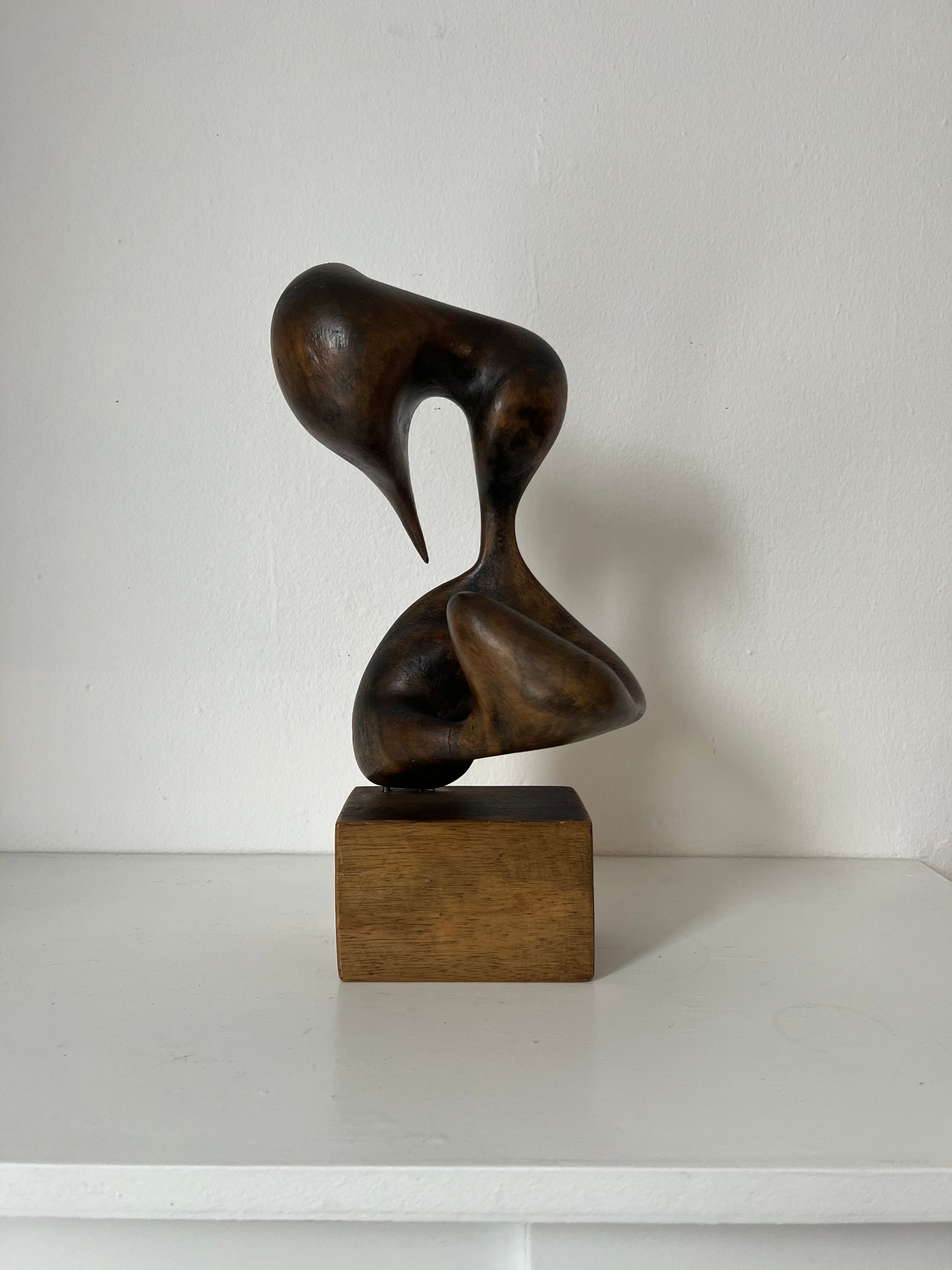 Unknown artist. Organic sculpture of carved patinated wood, mounted on wood base, 1930/40’s. H. 27/36 cm. Two original holes on top.