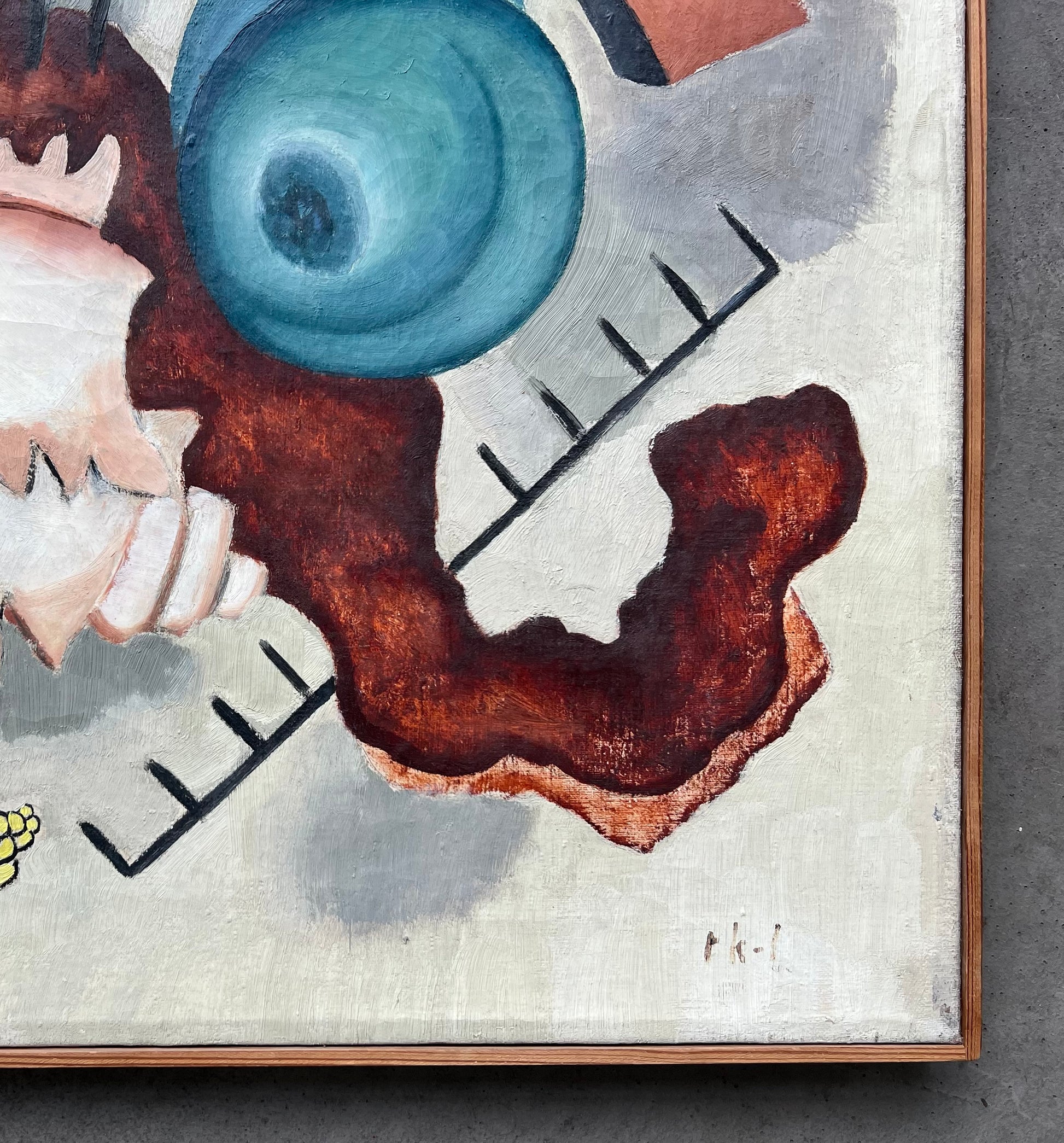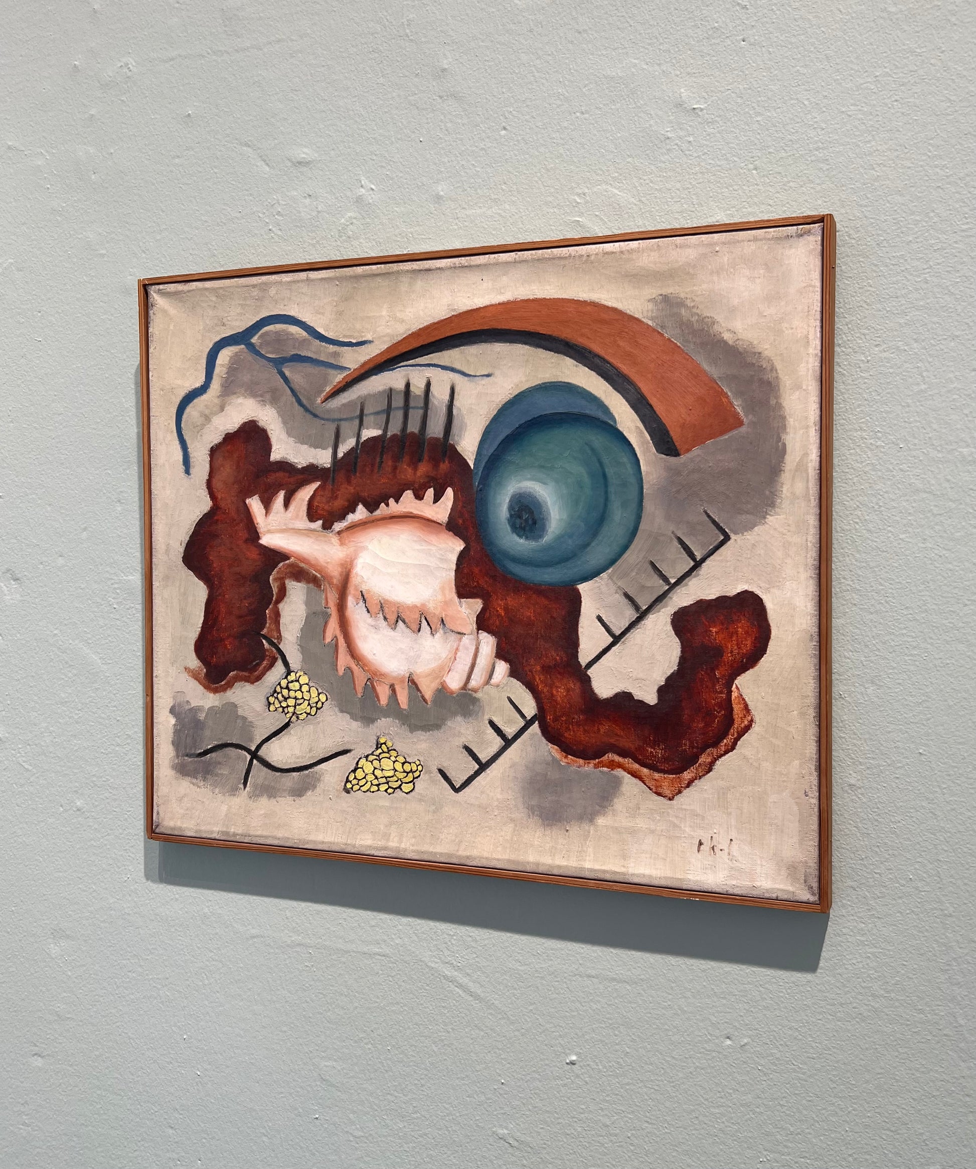 Rita Kernn-Larsen (1904-1998). “Fundet på stranden”, oil on canvas, signed. 46 x 55 cm. Pine frame.