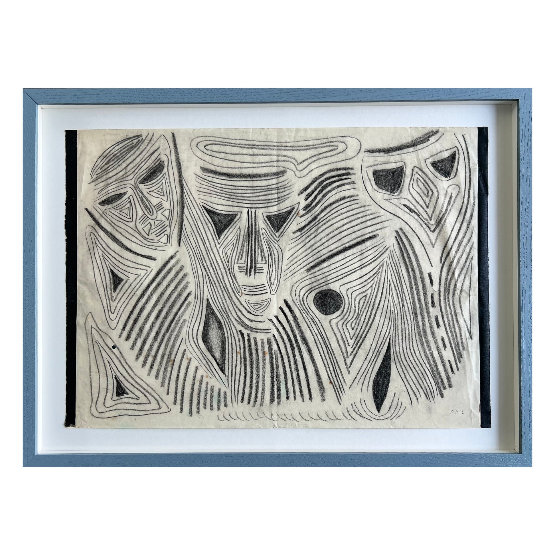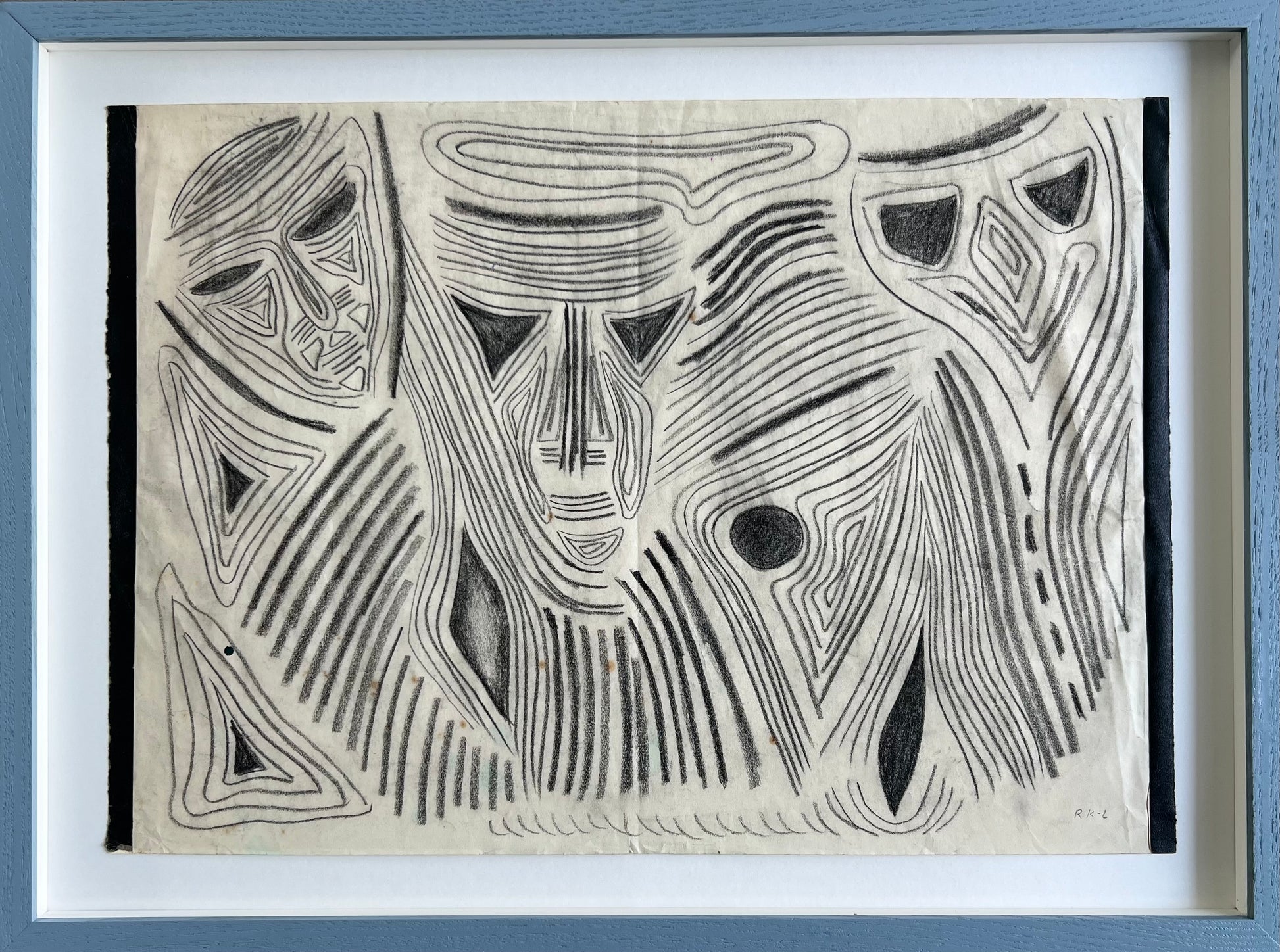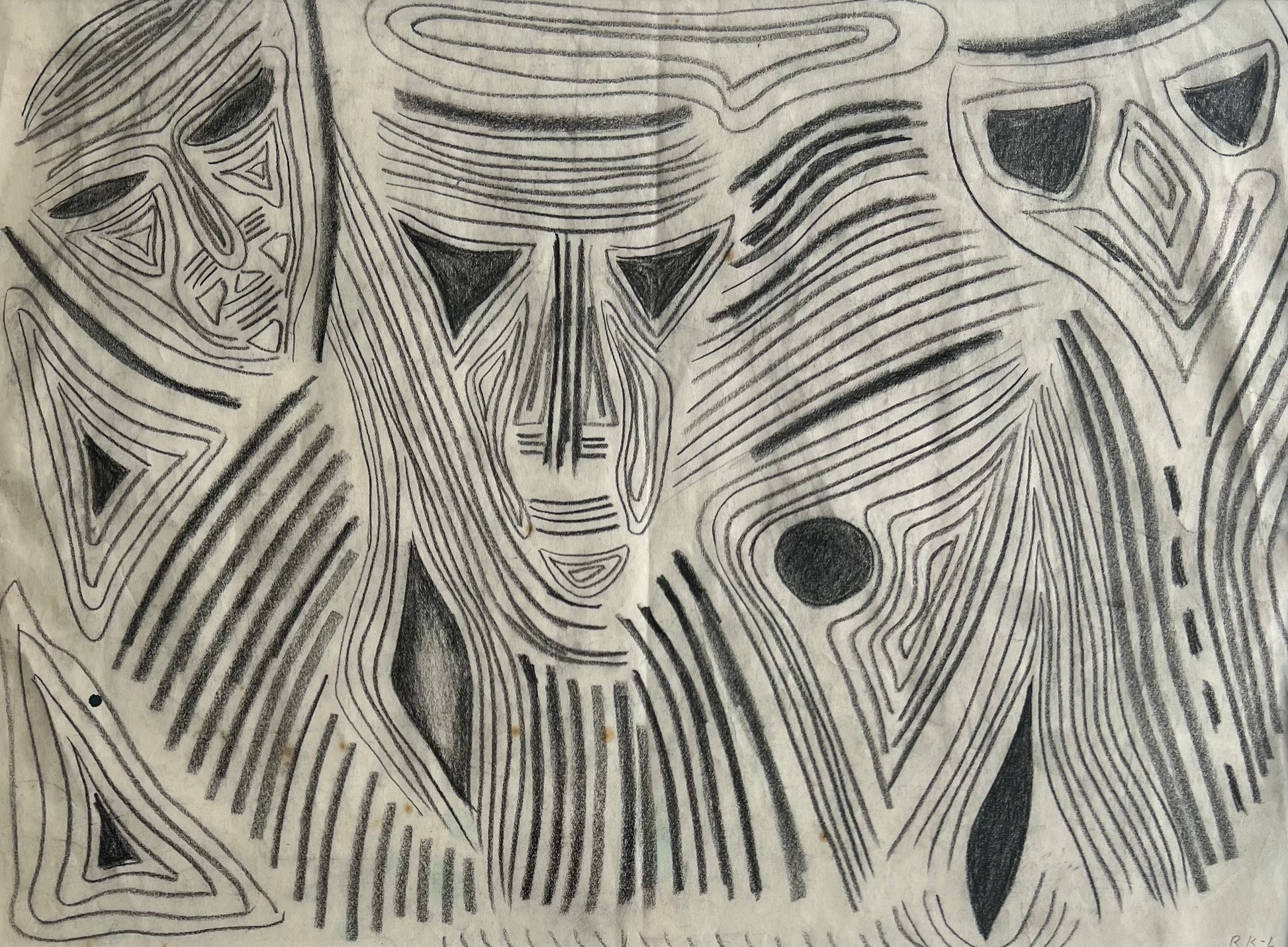Rita Kernn-Larsen (1904-1998). Three masks, oilchalk on paper, signed RK-L. 29 x 39 (36 x 50) cm. New handpainted wood frame, museum glass, acid free mounting.