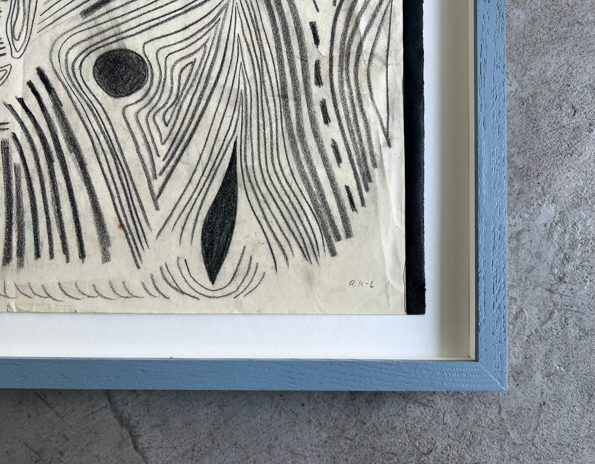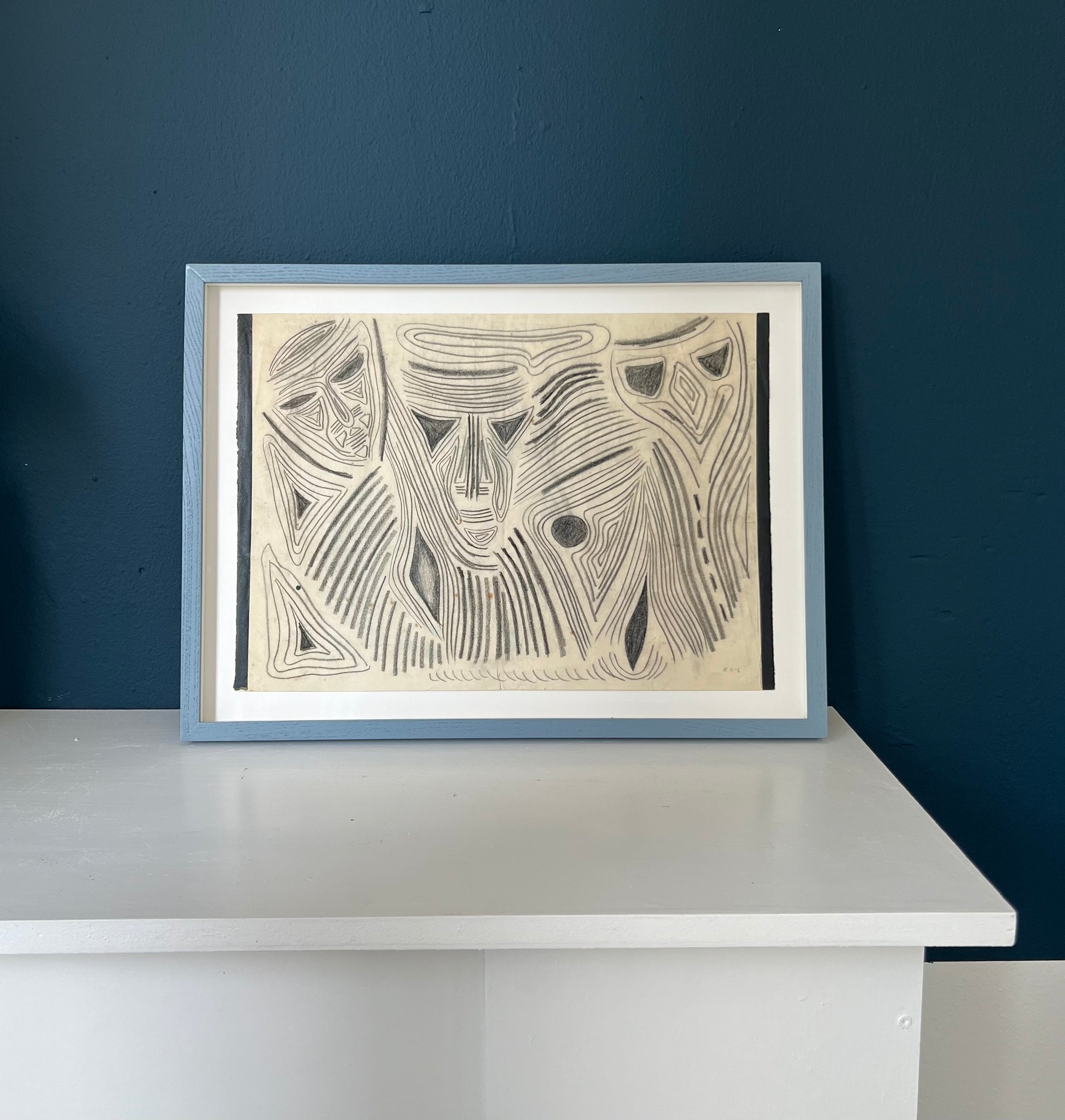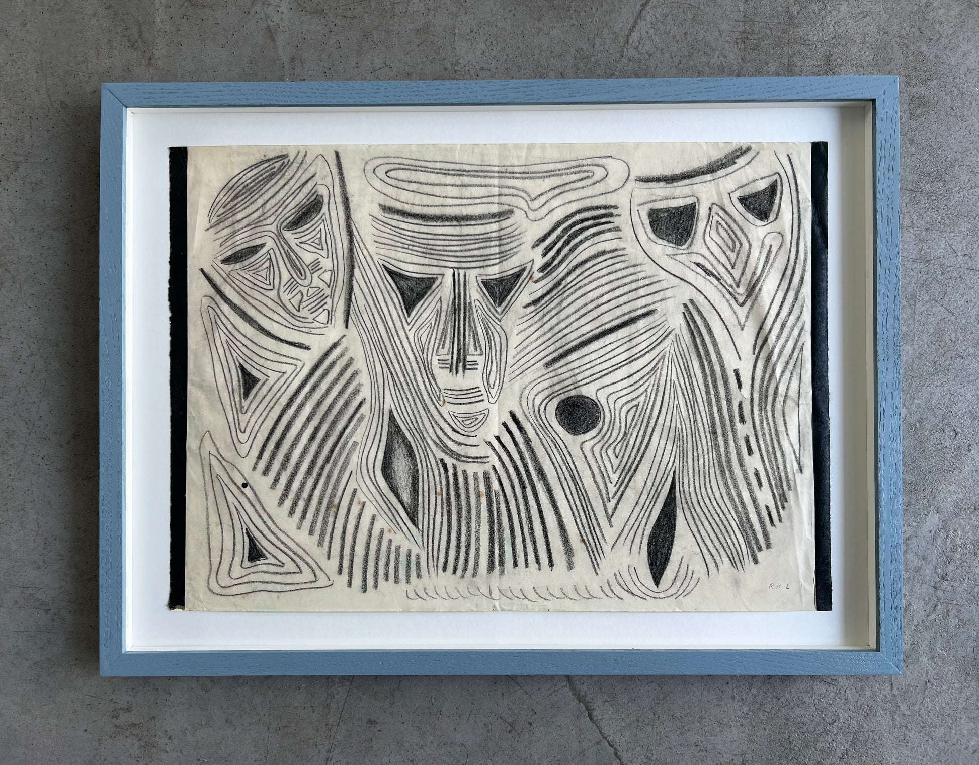 Rita Kernn-Larsen (1904-1998). Three masks, oilchalk on paper, signed RK-L. 29 x 39 (36 x 50) cm. New handpainted wood frame, museum glass, acid free mounting.